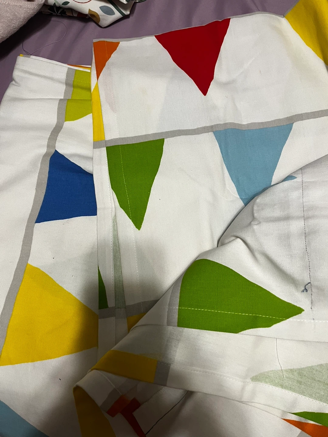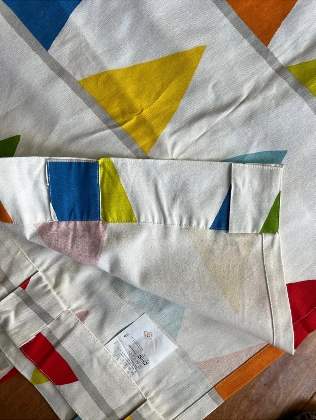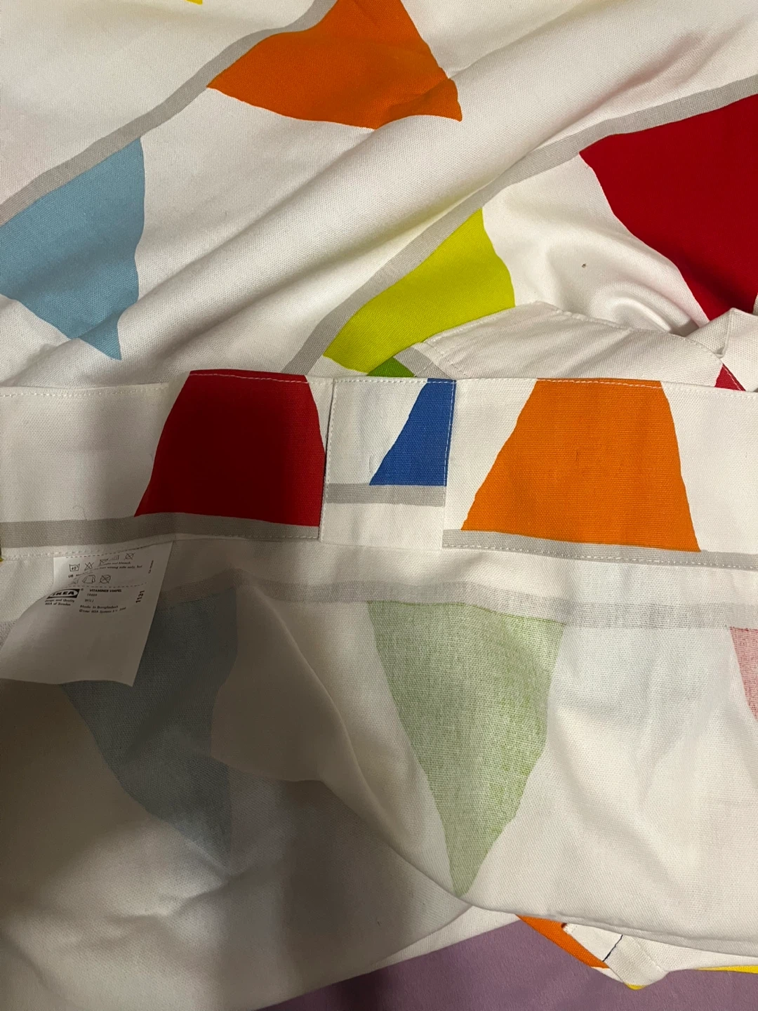 Bright and colourful IKEA VITAMINER VIMPEL curtains featuring a playful triangle pattern. Made from durable fabric. Machine washable at 40°C. Perfect for adding a pop of colour to any room!
