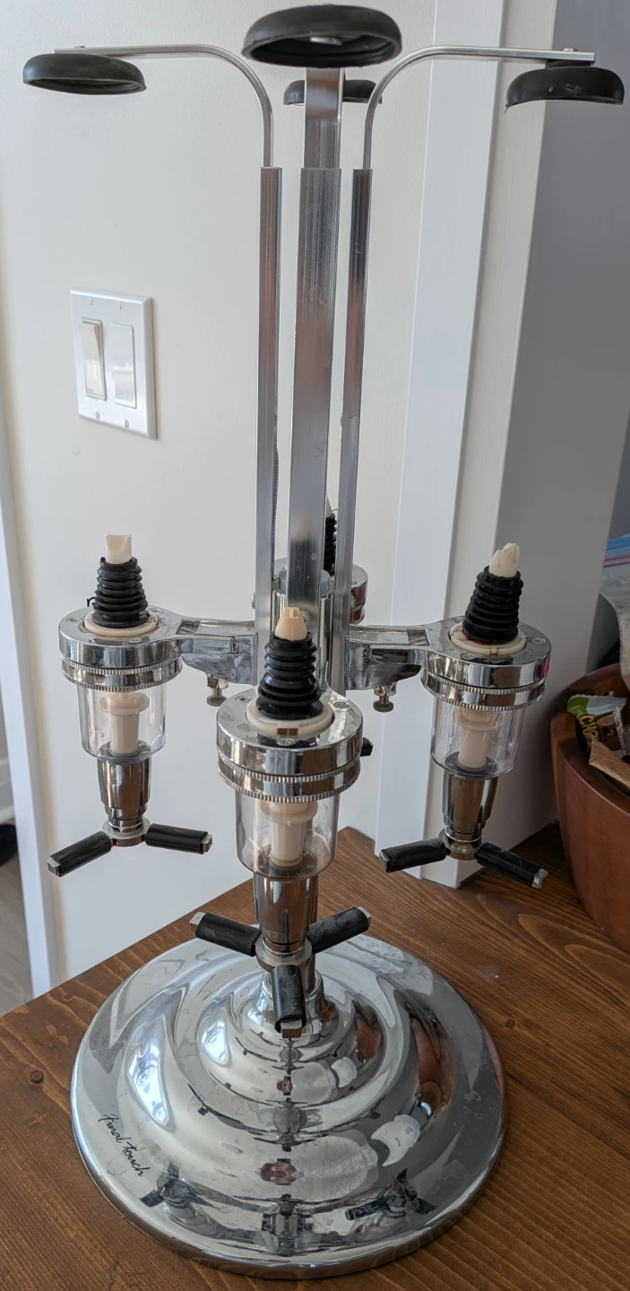 This is a Final Touch brand 4-bottle liquor dispenser. It's made of chrome-plated metal with a sturdy base. The carousel has individual spouts for each bottle.