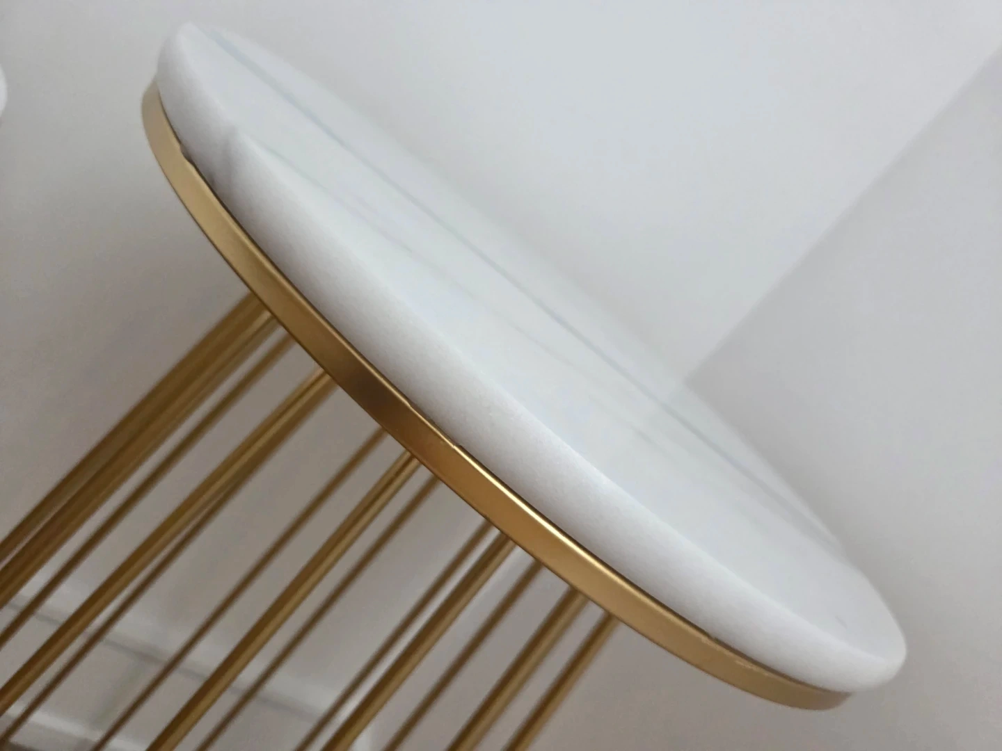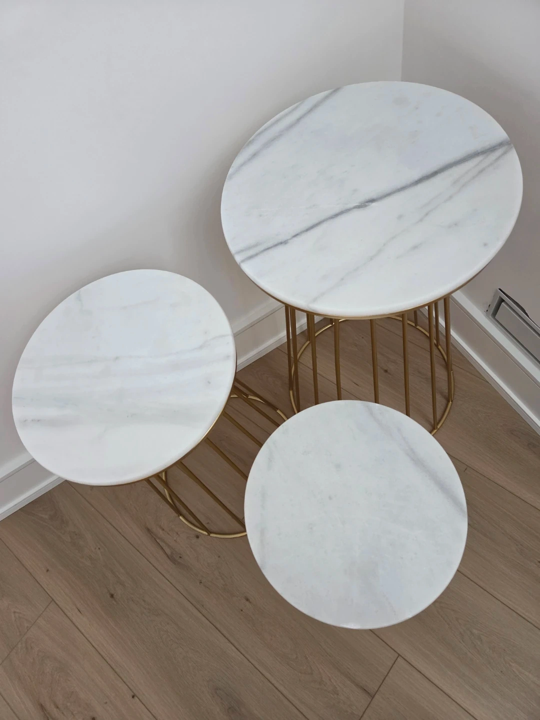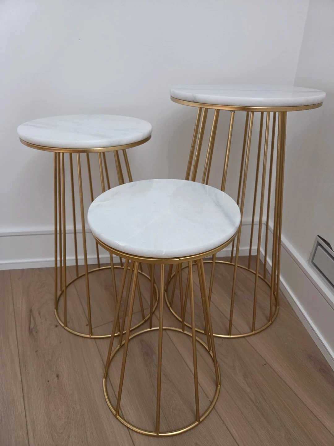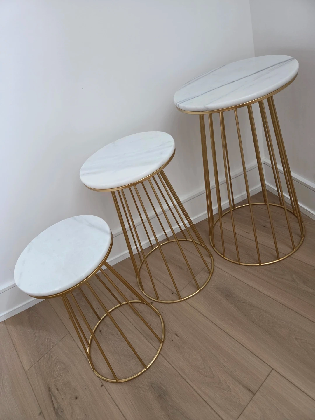 Set of three marble accent tables with white marble tops and gold metal wire bases. These tables offer a stylish and versatile accent for any room.