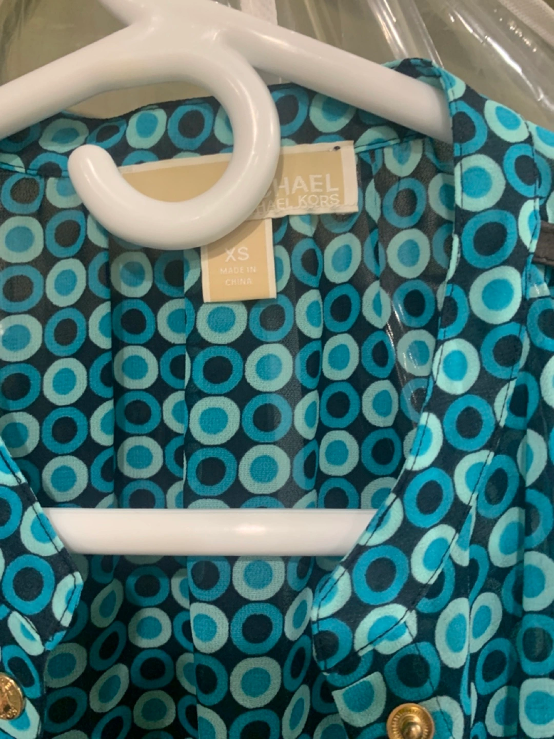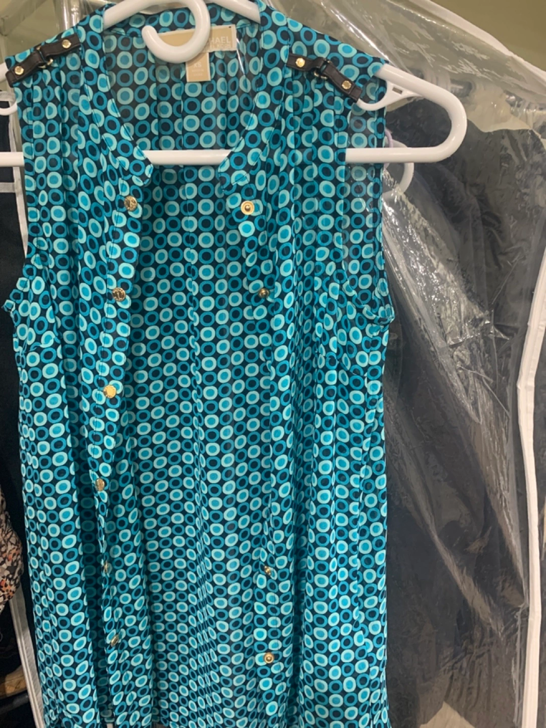 Women's sleeveless blouse. Teal and black geometric pattern. Gold-toned buttons and shoulder accents. Size extra small.