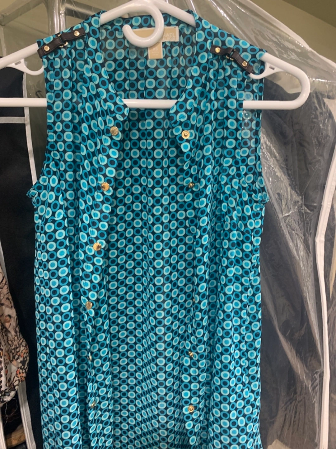 Women's sleeveless blouse. Teal and black geometric pattern. Gold-toned buttons and shoulder accents. Size extra small.