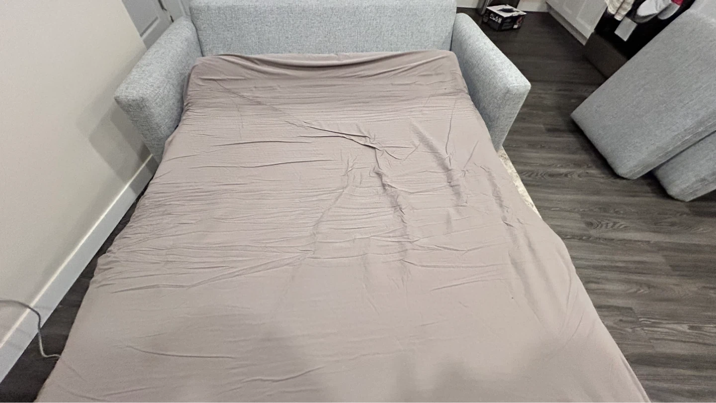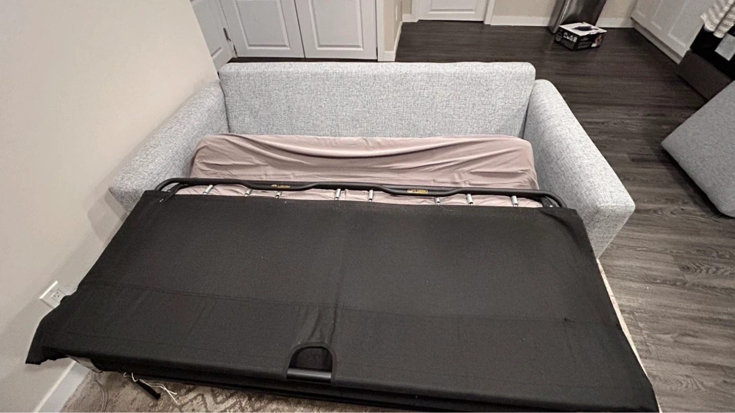 A grey sofa with a double pull-out mattress frame. Perfect for small spaces needing extra sleeping arrangements, simple to use, easy to set up and fold back, in great shape. Priced to sell fast.