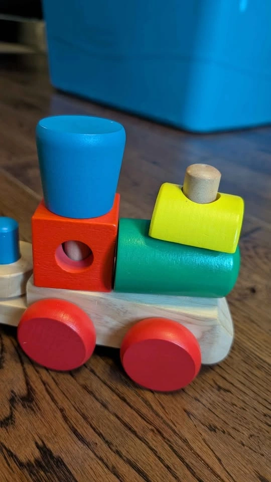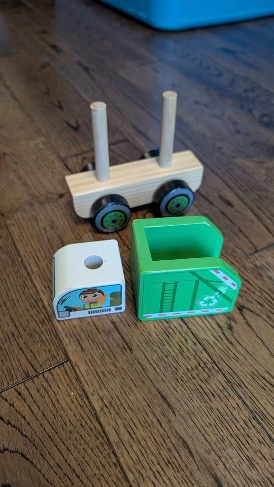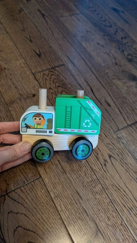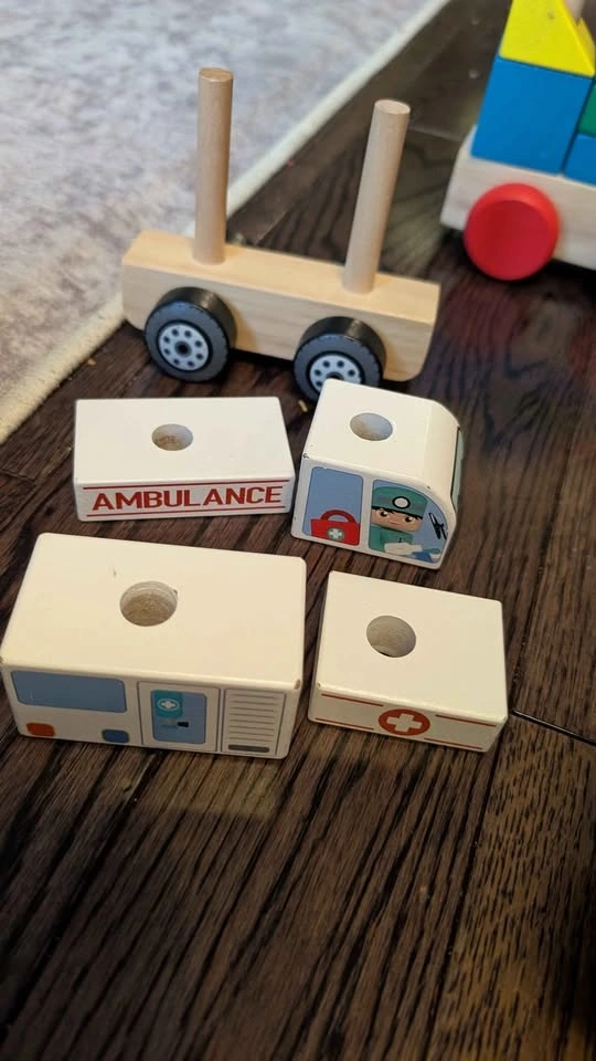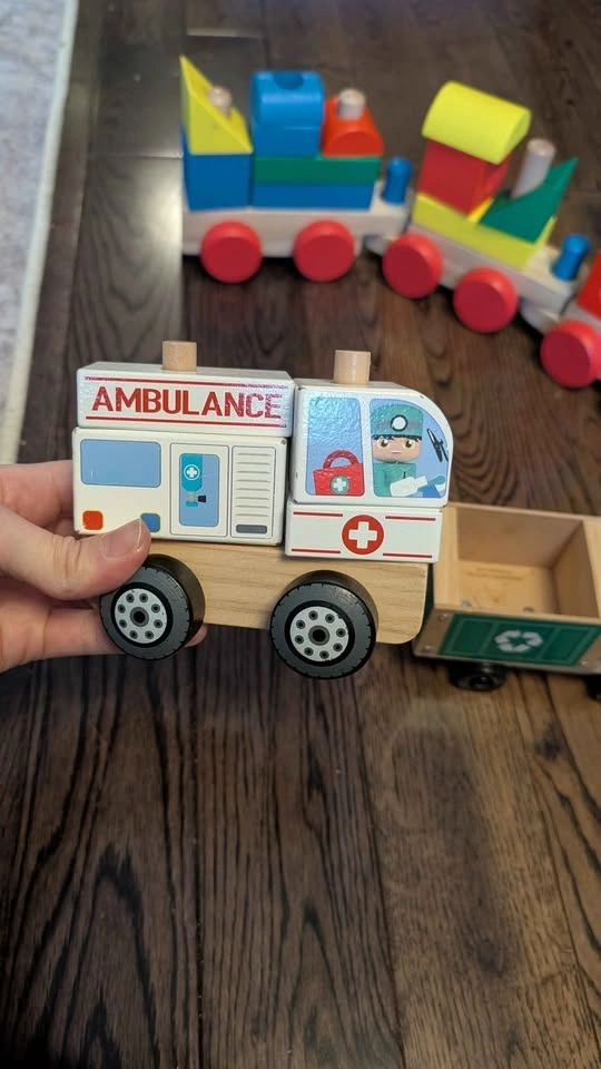 Melissa and Doug wood train stacking toy. Ambulance wood stacking toy. Garbage truck wood stacking toy. Trash recycling truck wood vehicle. Located near Greenwood and Danforth area .