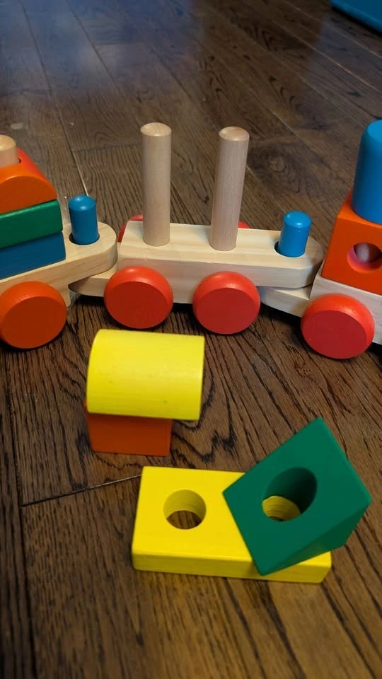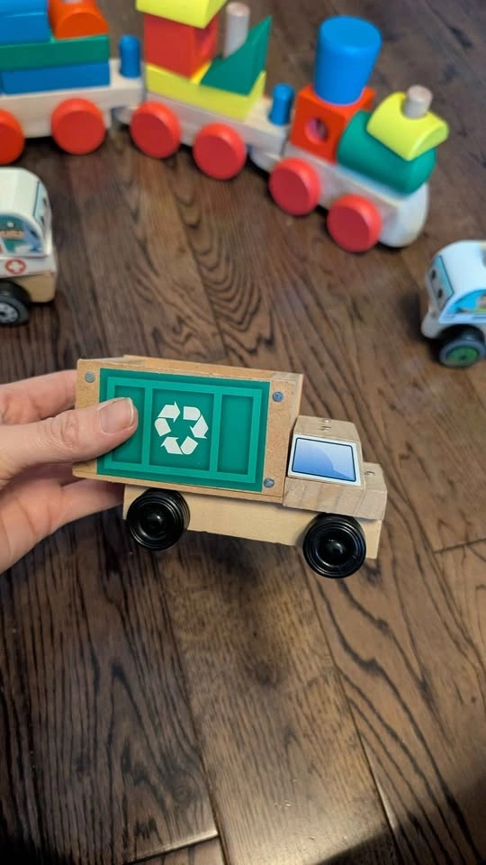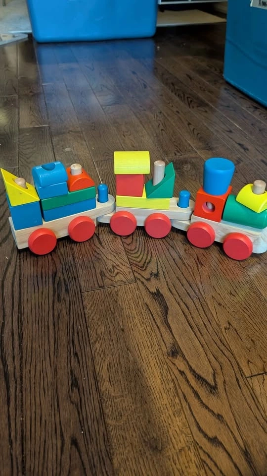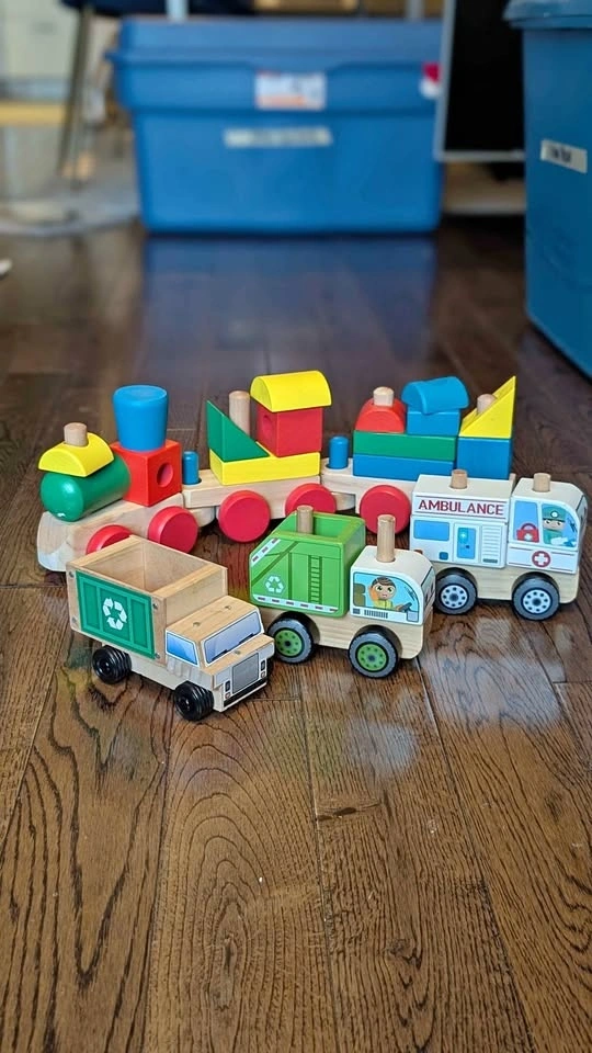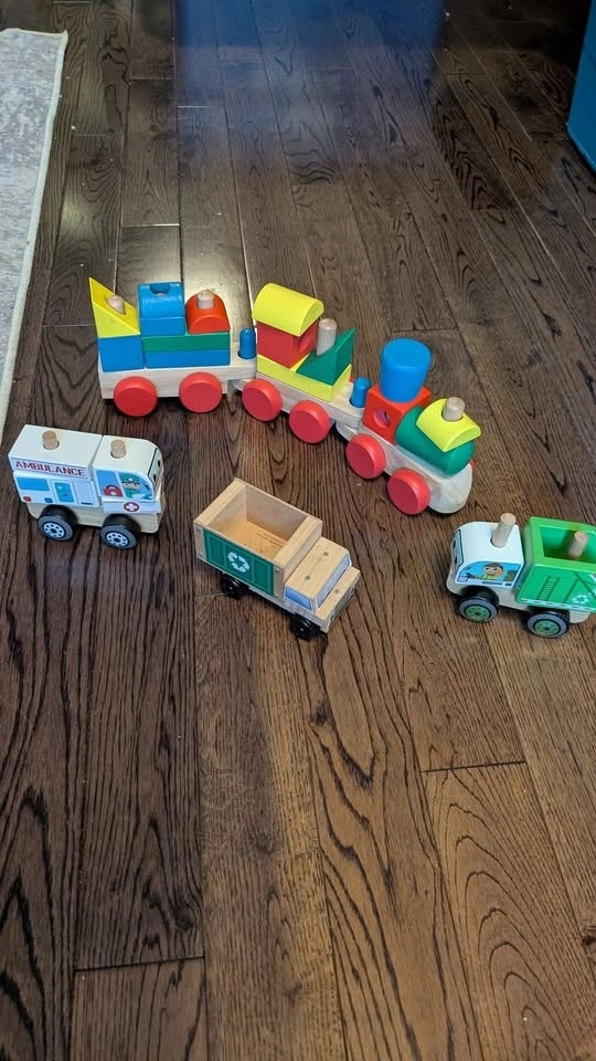Melissa and Doug wood train stacking toy. Ambulance wood stacking toy. Garbage truck wood stacking toy. Trash recycling truck wood vehicle. Located near Greenwood and Danforth area .