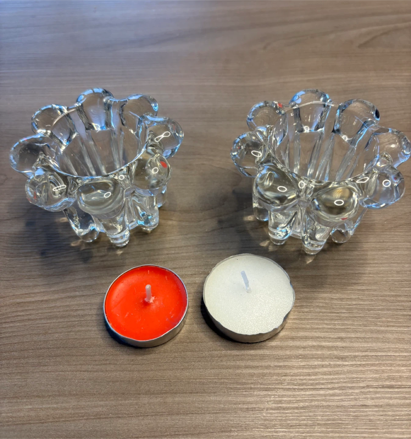 Selling a set of two clear glass flower-shaped tea light candle holders. They're in great condition and ready to add a touch of cozy to your space! Comes with two tea light candles in the photos.