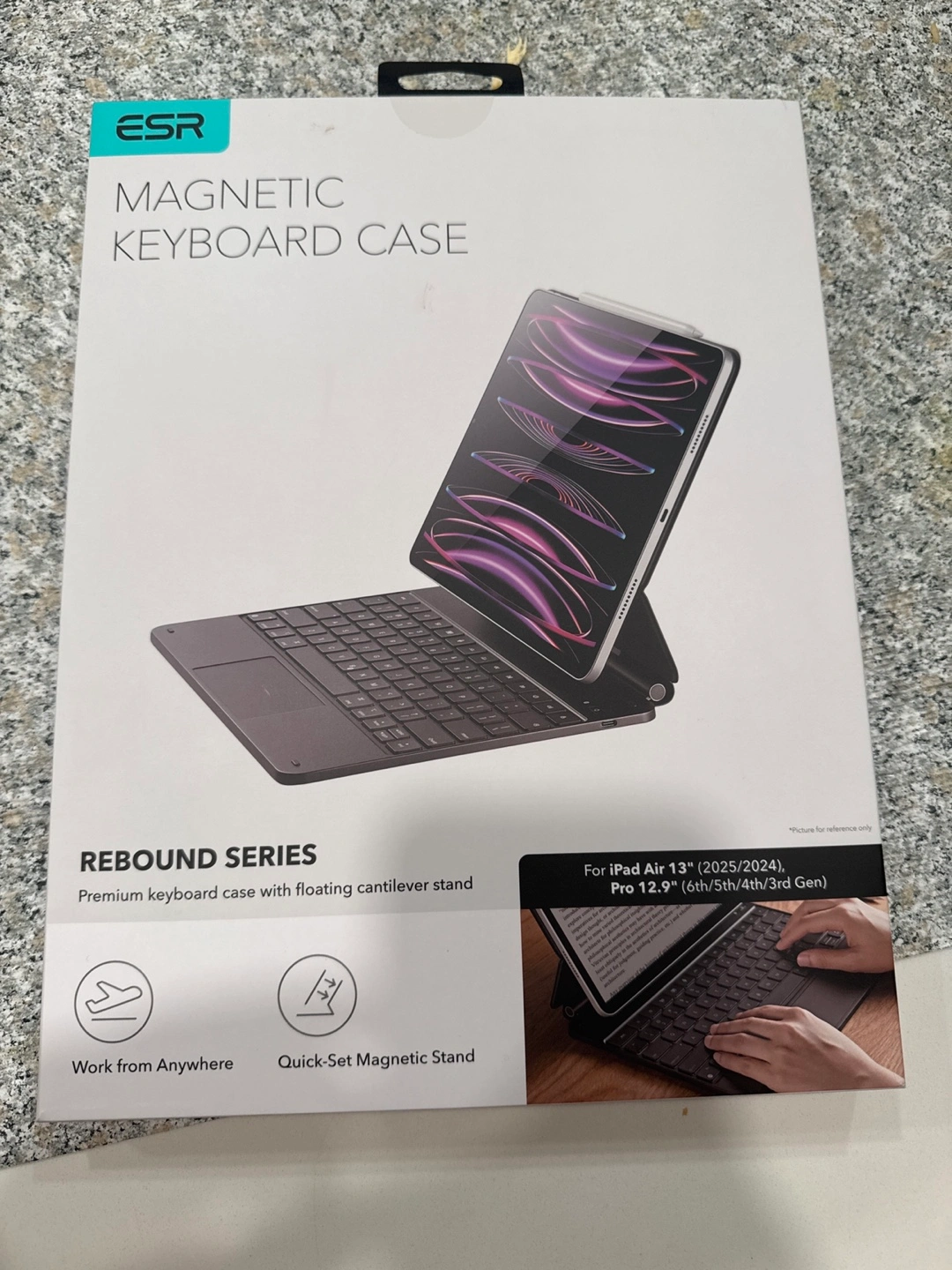 Selling an ESR Rebound Series Magnetic Keyboard Case for the iPad Air 13". It's in excellent condition and comes with the box. It features a quick-set magnetic stand and premium laptop-style keys. Designed to work from anywhere!