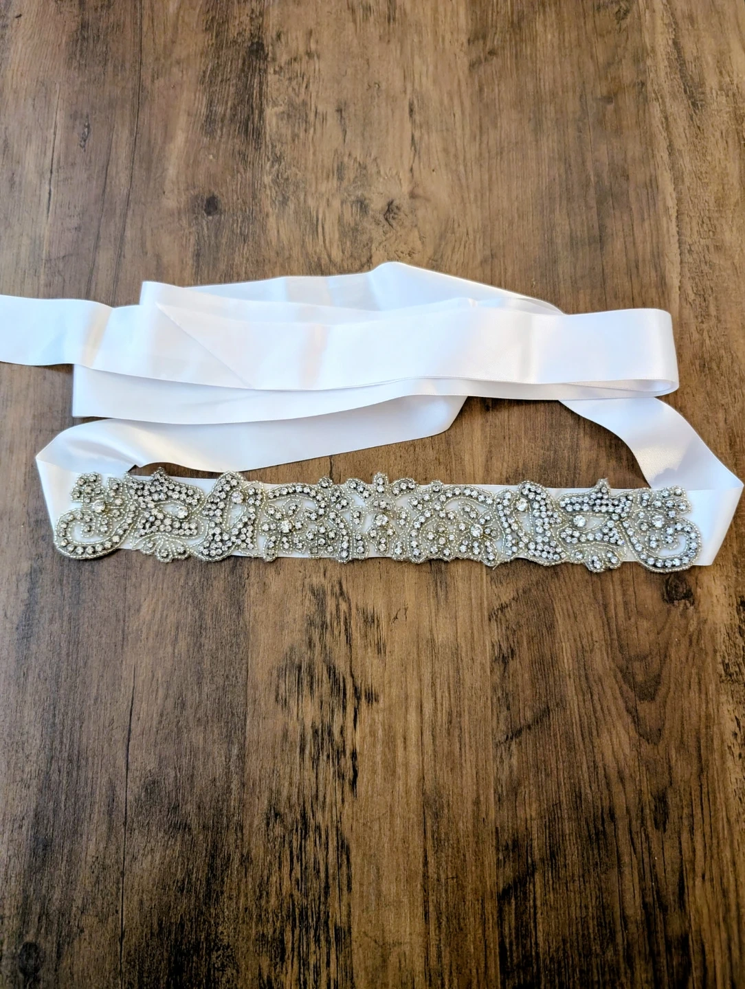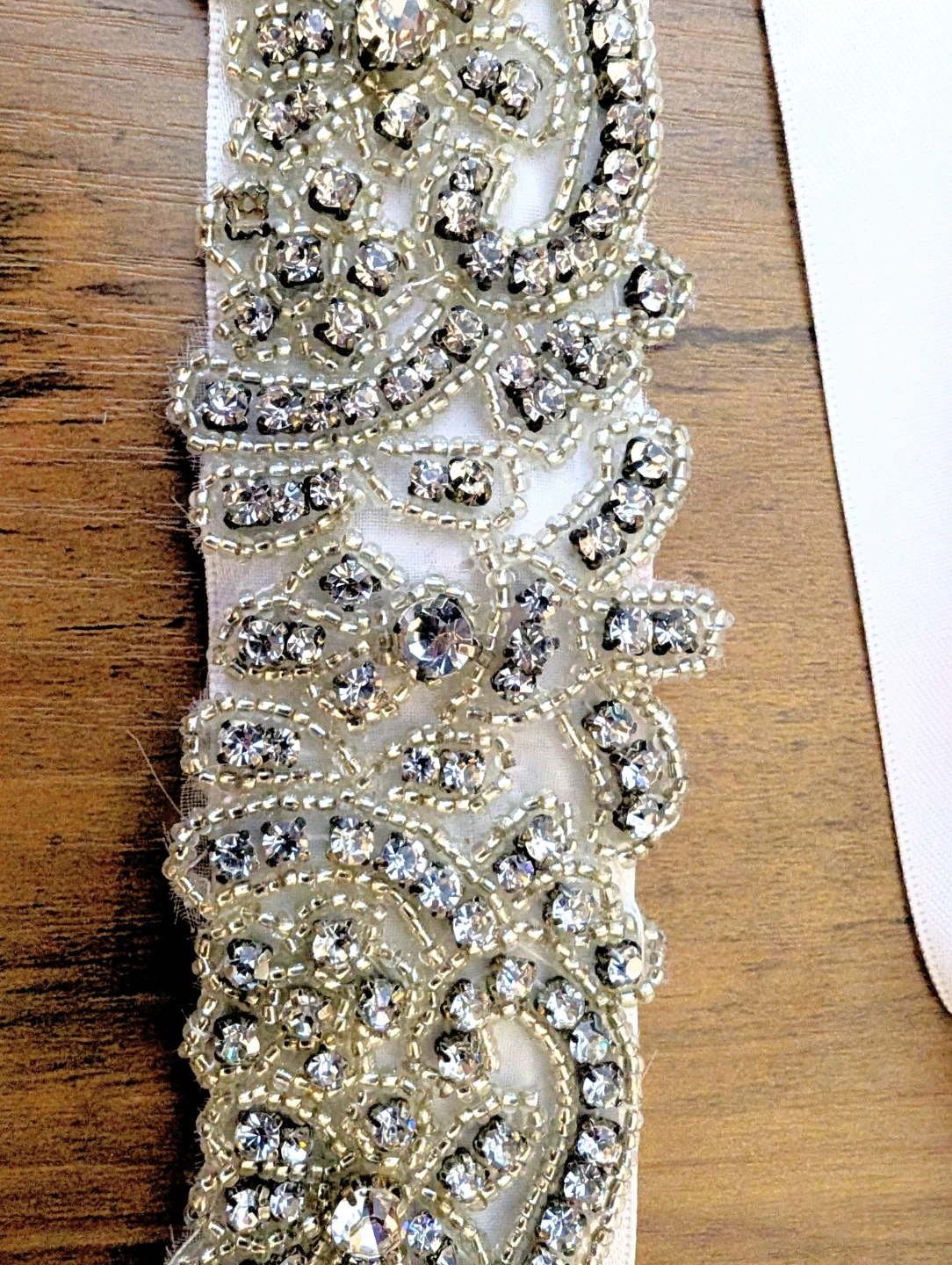 A beautiful bridal sash featuring intricate beadwork and clear crystals on a white ribbon. It's perfect for adding sparkle to a wedding dress or formal gown. The satin ribbon ties securely at the back.