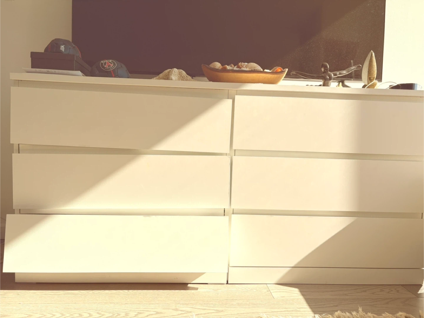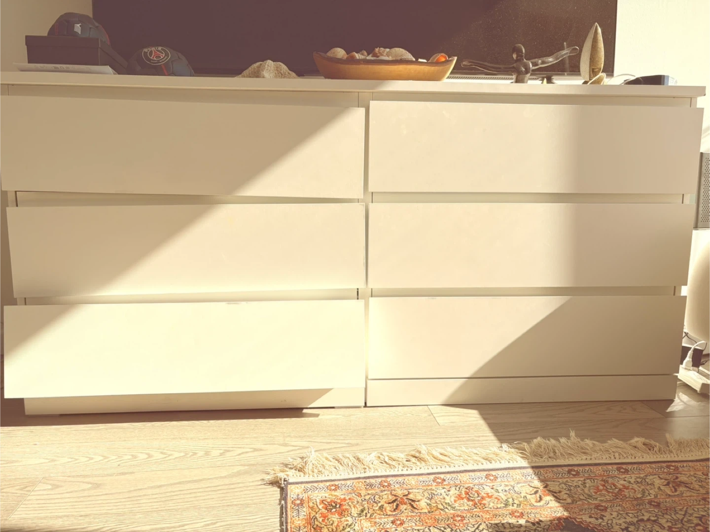 This is a white dresser with six drawers. It's made of a particleboard or composite material. The dresser offers ample storage space.