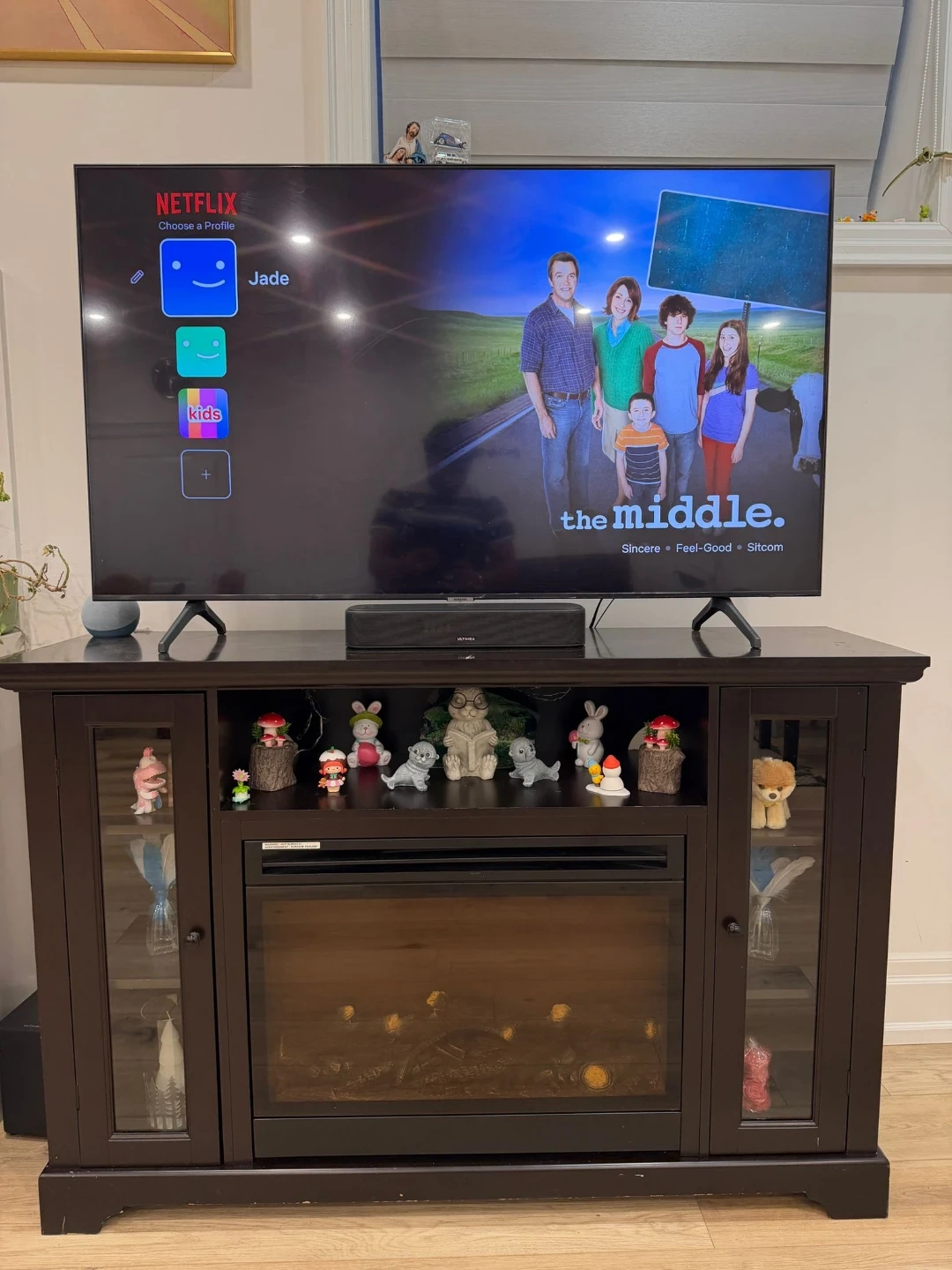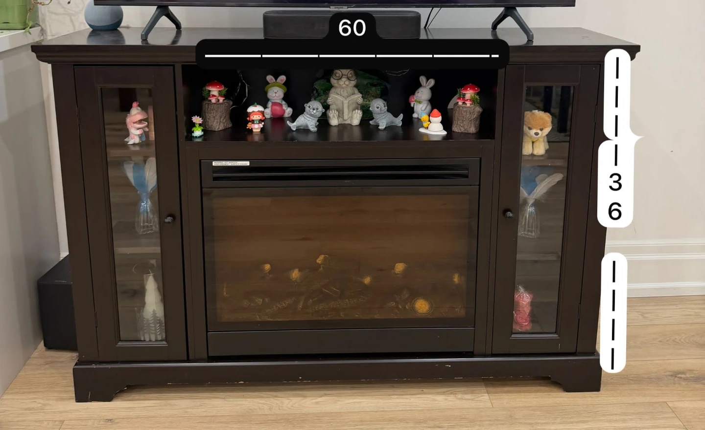 A stylish dark wood entertainment unit featuring glass doors on the sides and an electric fireplace in the centre. It's 60 inches wide and provides ample storage space! This unit is perfect for organizing your media and adding a cozy ambiance to your living room.