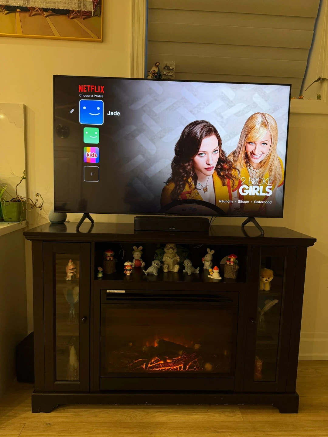 A stylish dark wood entertainment unit featuring glass doors on the sides and an electric fireplace in the centre. It's 60 inches wide and provides ample storage space! This unit is perfect for organizing your media and adding a cozy ambiance to your living room.