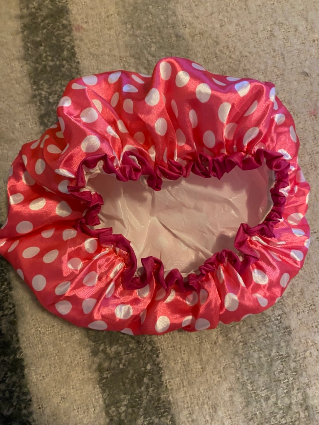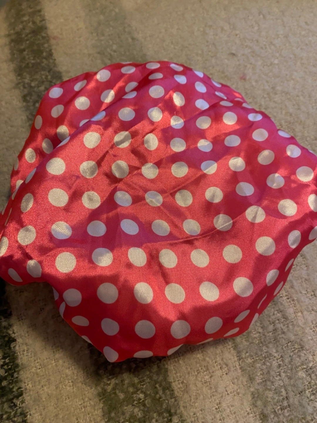Selling a pink polka dot hair bonnet. It's in great condition and ready to help keep your hair protected while you sleep or relax or shower 🚿