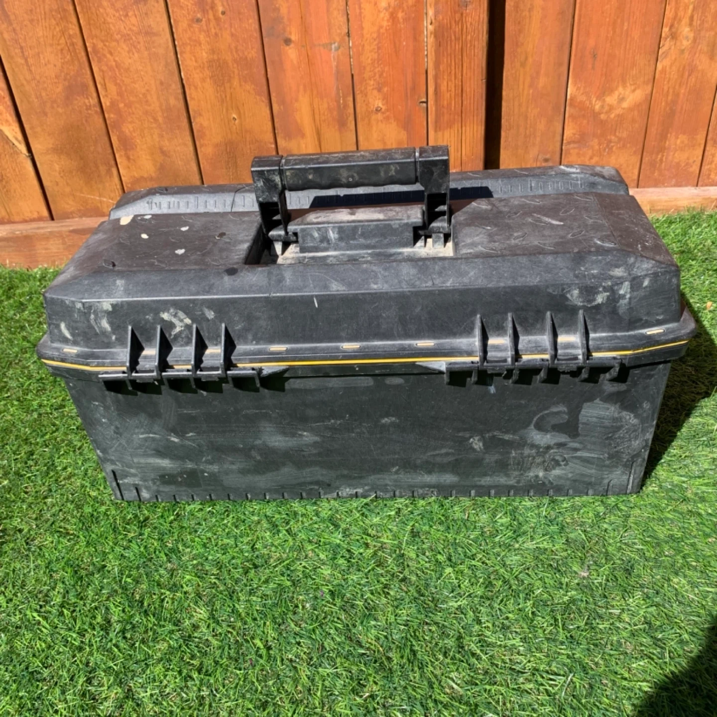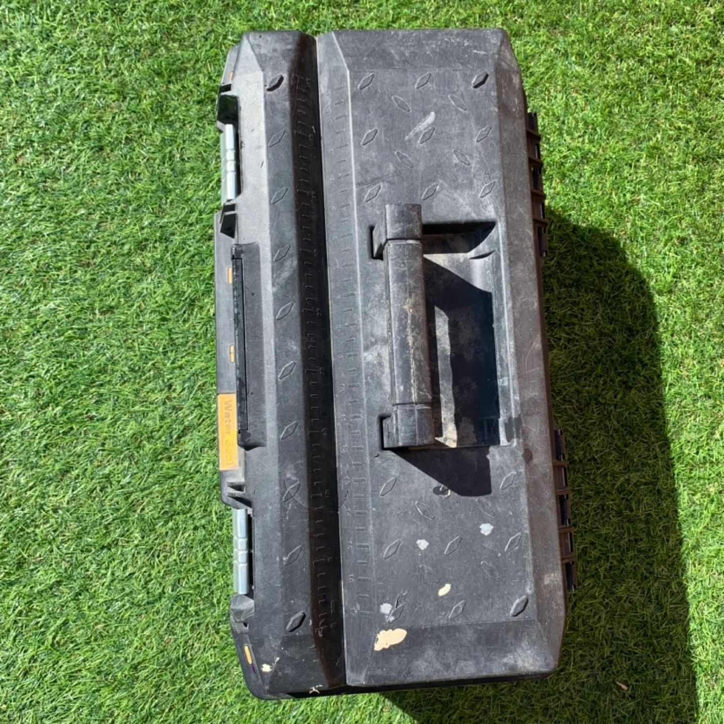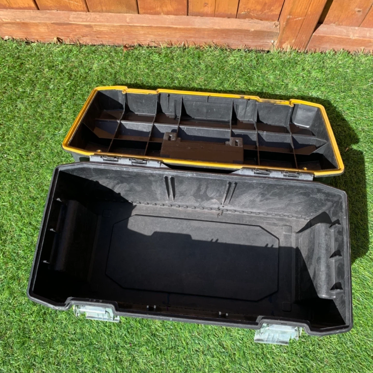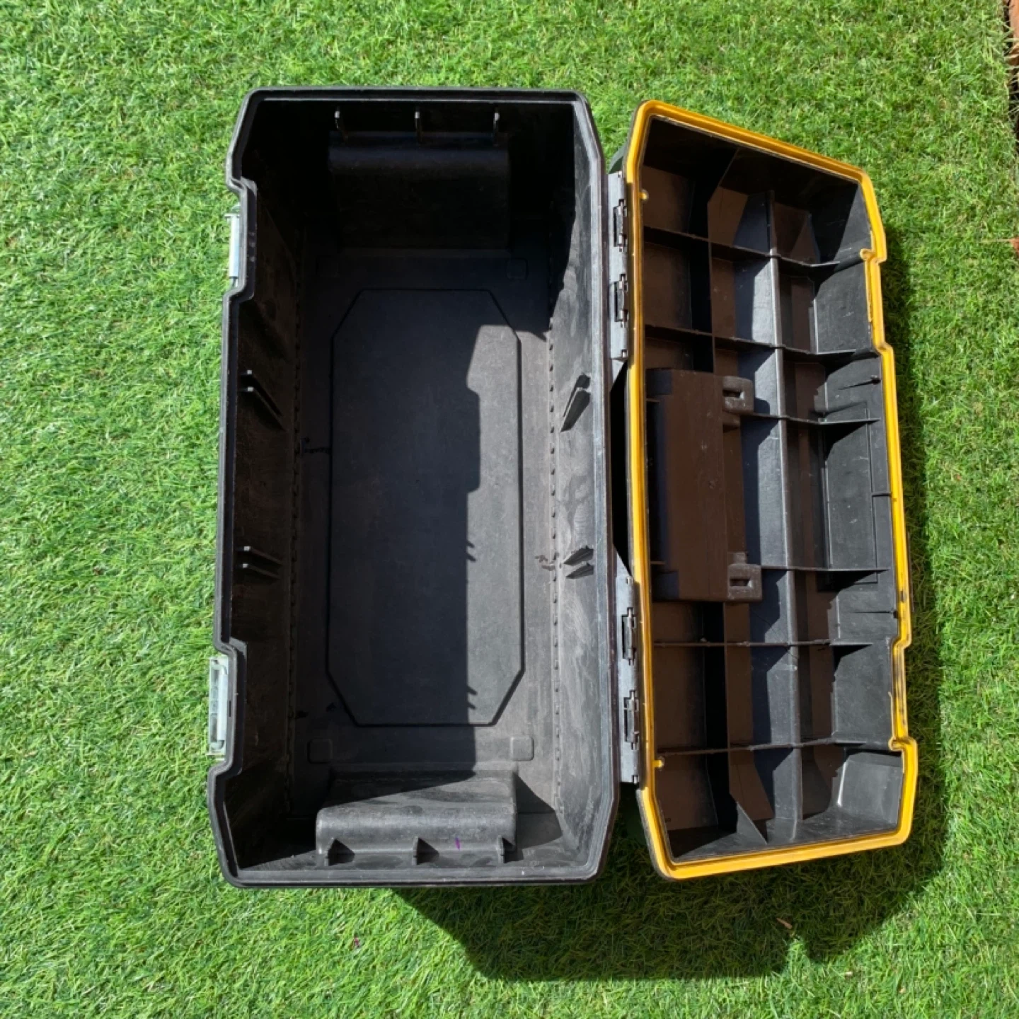Stanley FatMax toolbox tool box organizer – durable black and yellow case designed for storing and transporting tools. Features top lid compartments for small parts and a spacious interior for larger tools. Great for home, garage, or job site use. Small thin crack on top (does not affect structure or function – see photo).