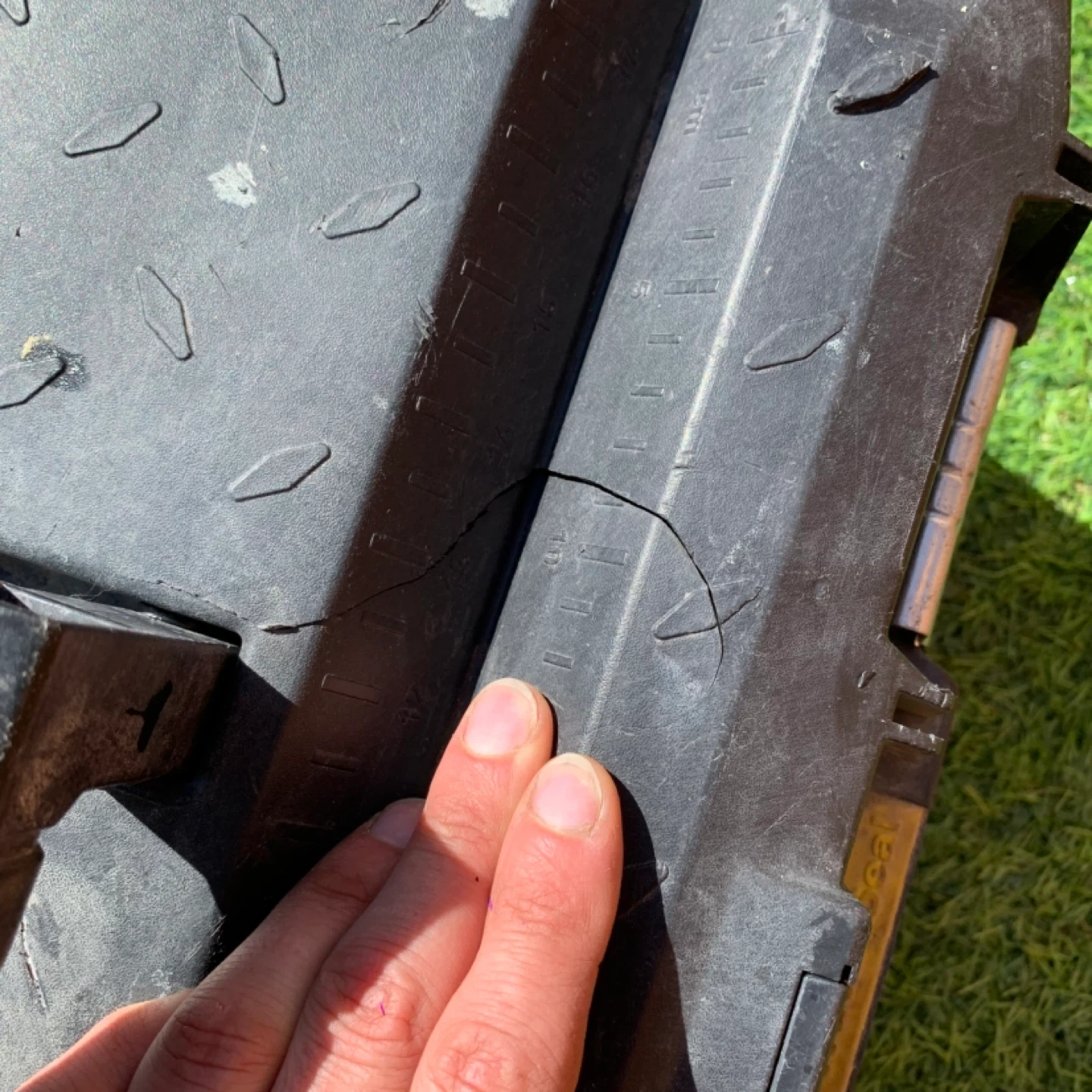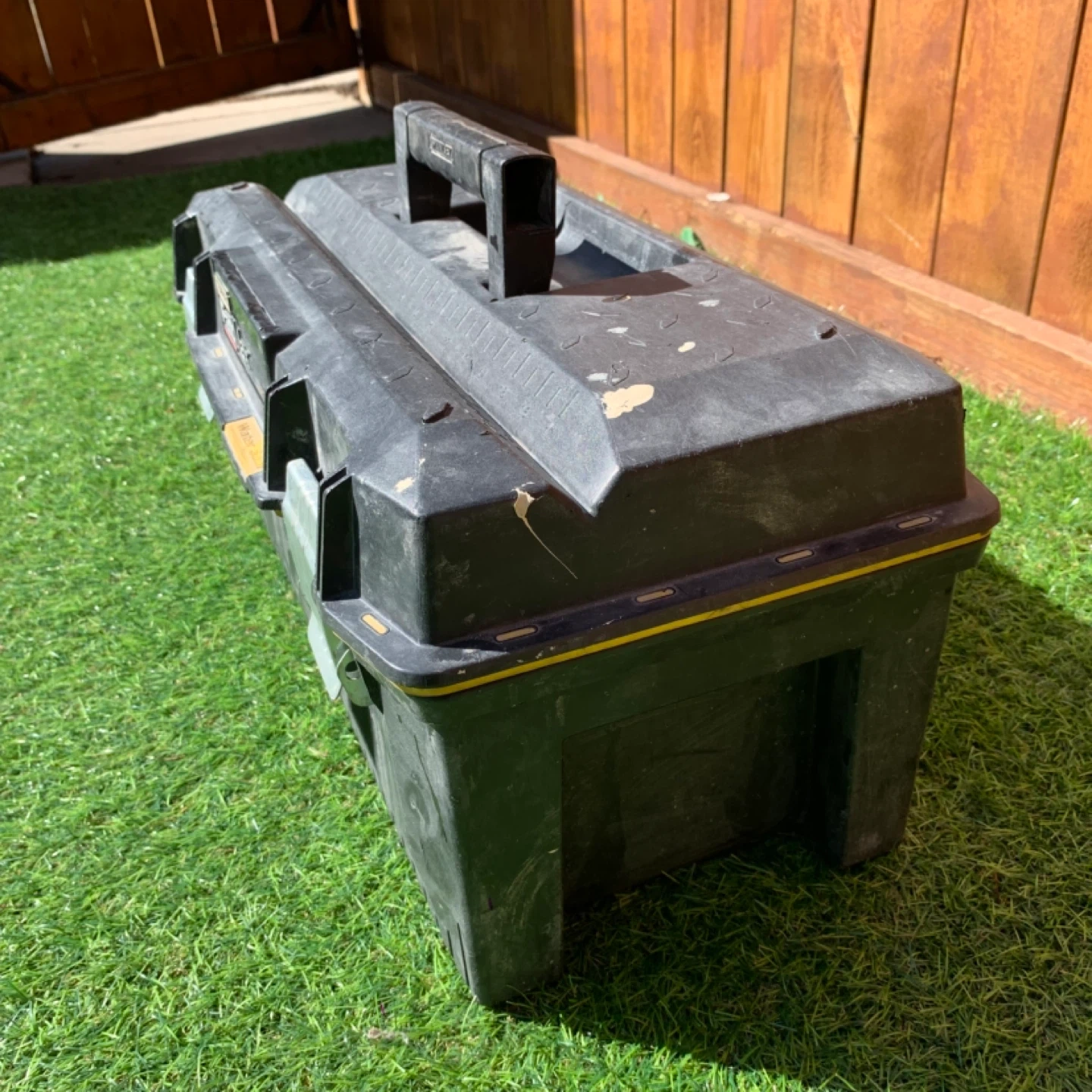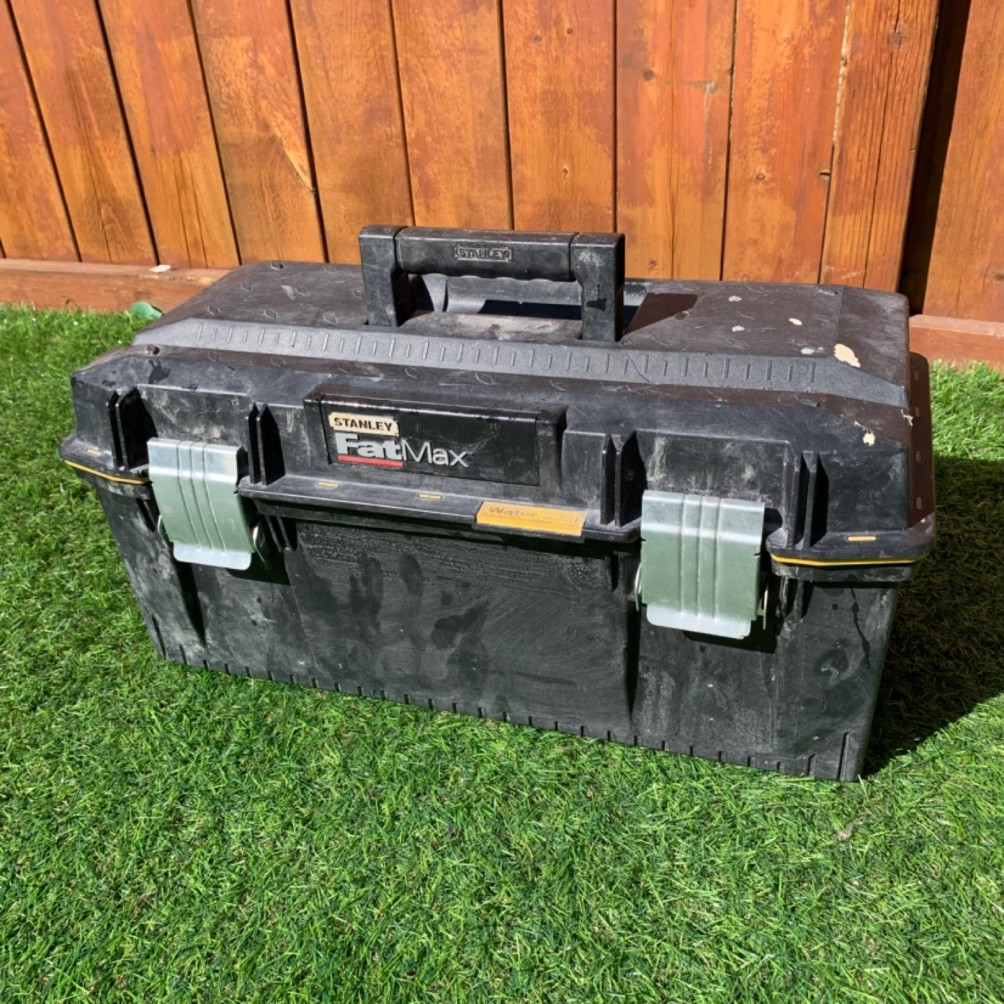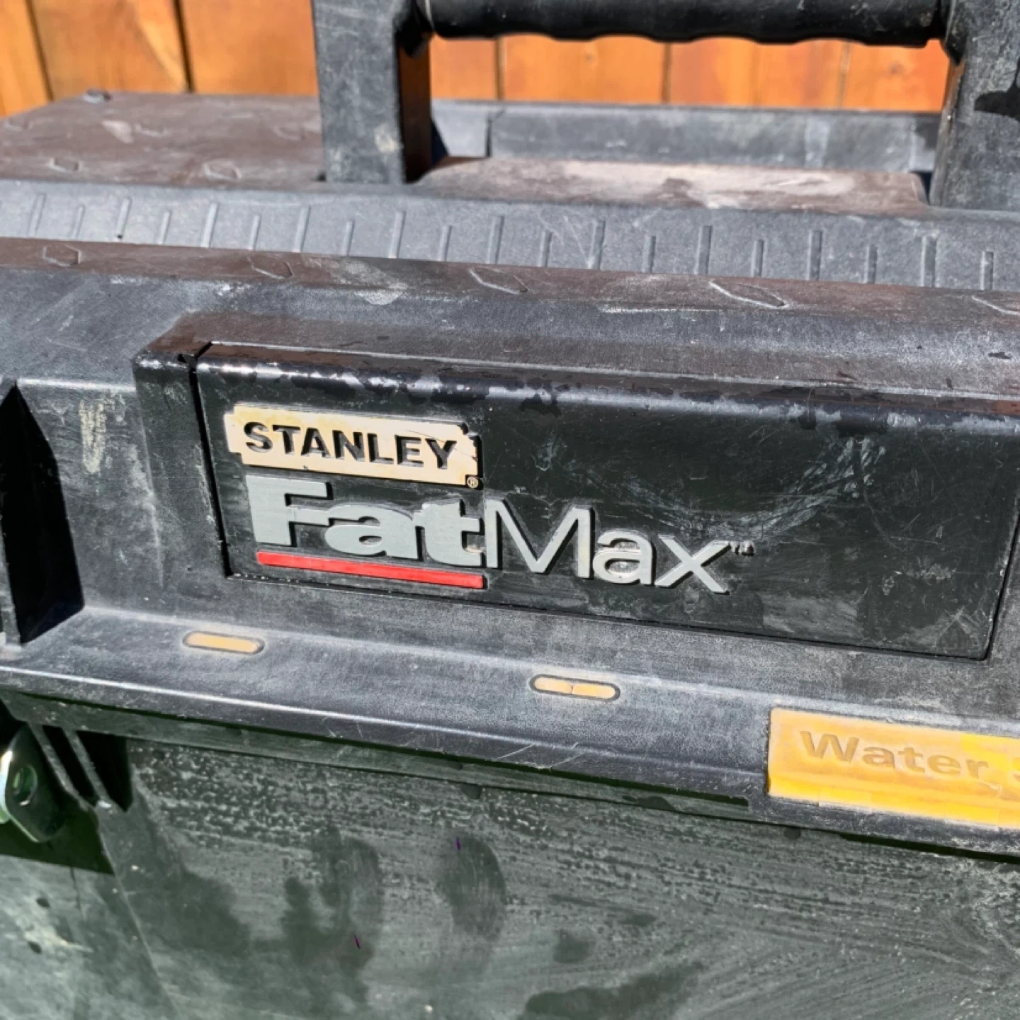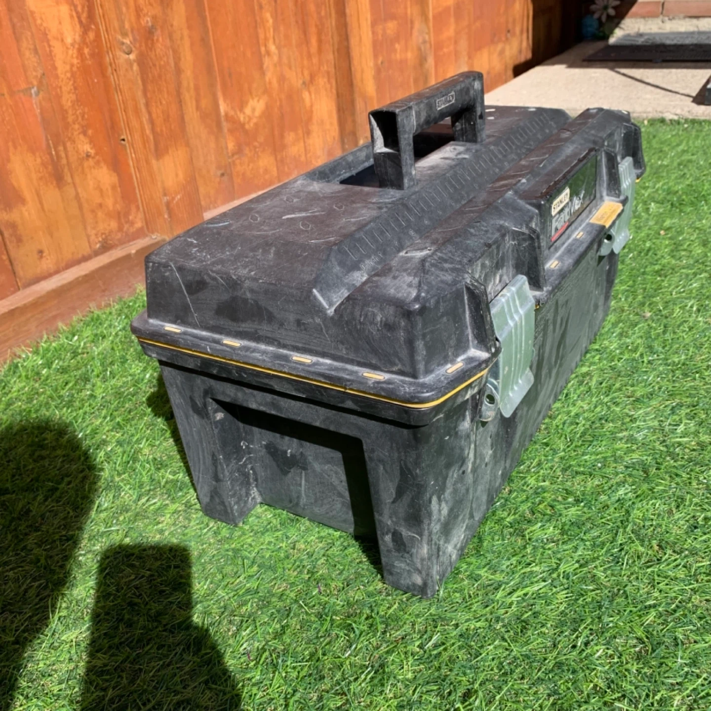 Stanley FatMax toolbox tool box organizer – durable black and yellow case designed for storing and transporting tools. Features top lid compartments for small parts and a spacious interior for larger tools. Great for home, garage, or job site use. Small thin crack on top (does not affect structure or function – see photo).