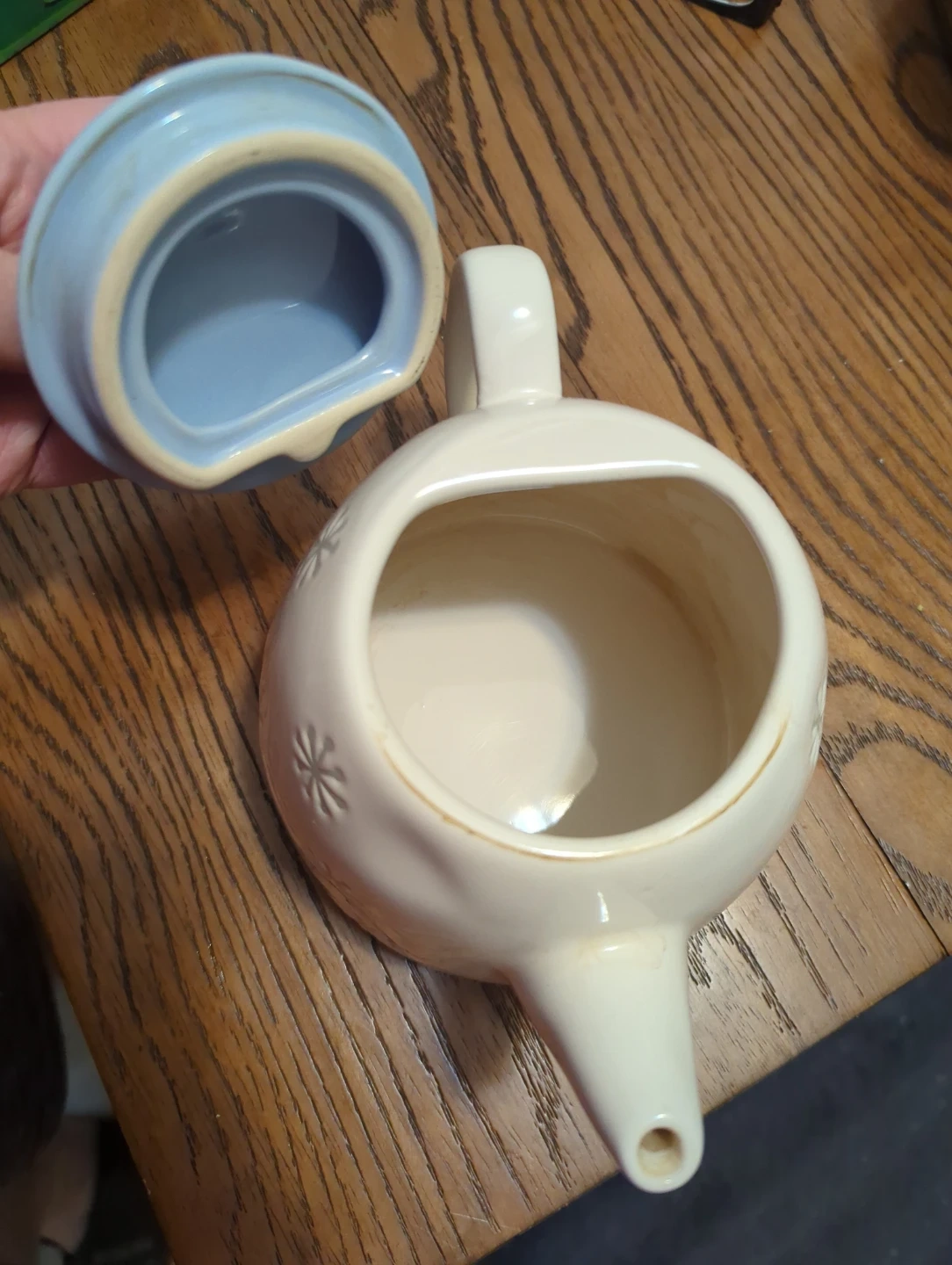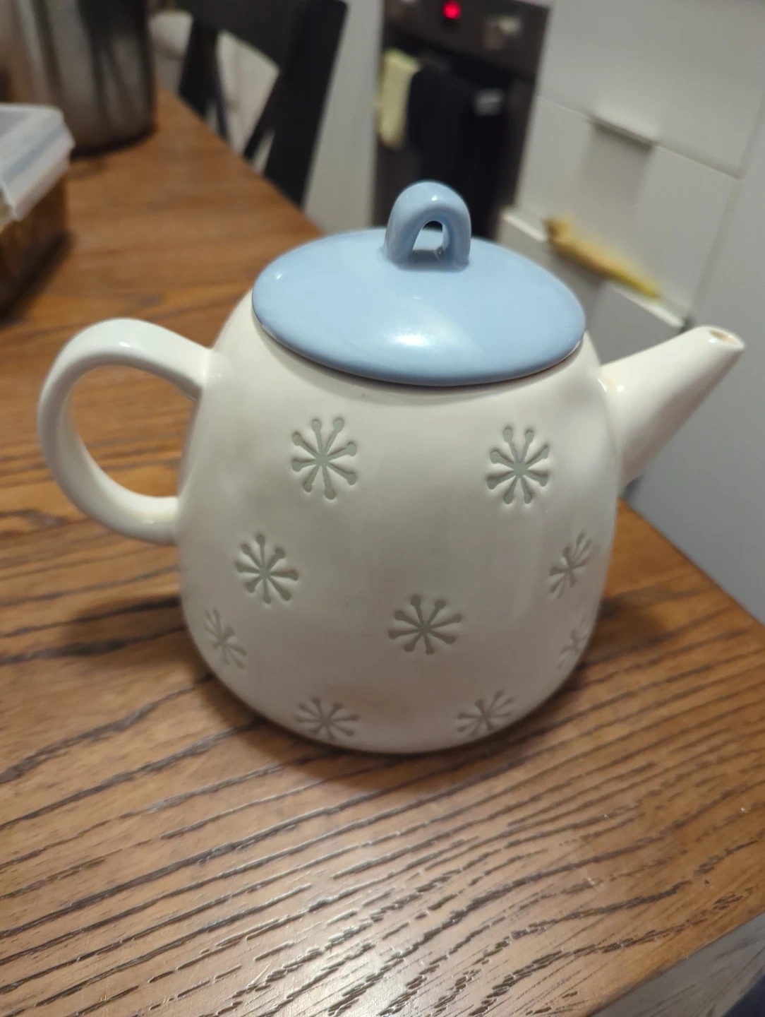 Cream ceramic teapot with a light blue lid, decorated with small starburst imprints. It has a classic handle and spout design. Perfect for serving tea!