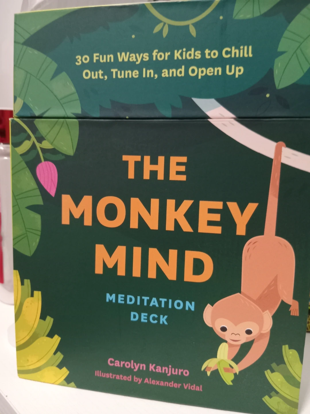 The Monkey Mind Meditation Deck offers 30 fun ways for kids to chill out, tune in, and open up. It's illustrated by Alexander Vidal and written by Carolyn Kanjuro. This deck is designed to help children learn mindfulness techniques.