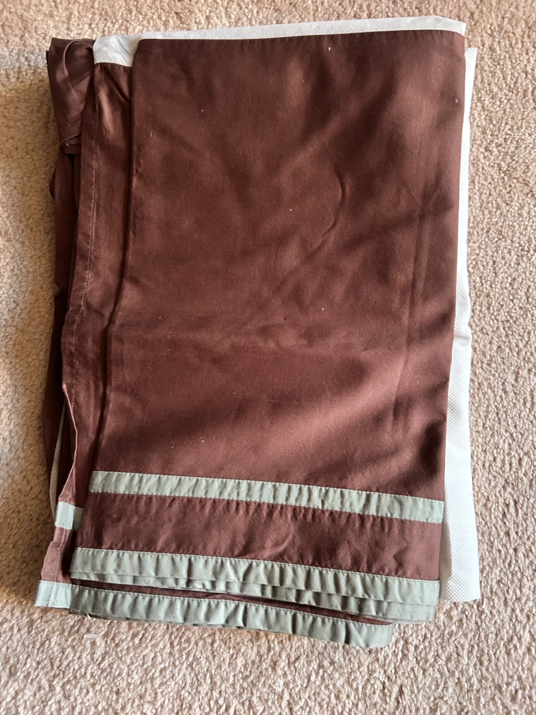 Brown bedskirt with white backing . Features two decorative Aqua bands near the hem. It's queen size but can be used on a double/full size bed if you tuck the extra 6 inches of fabric under the mattress