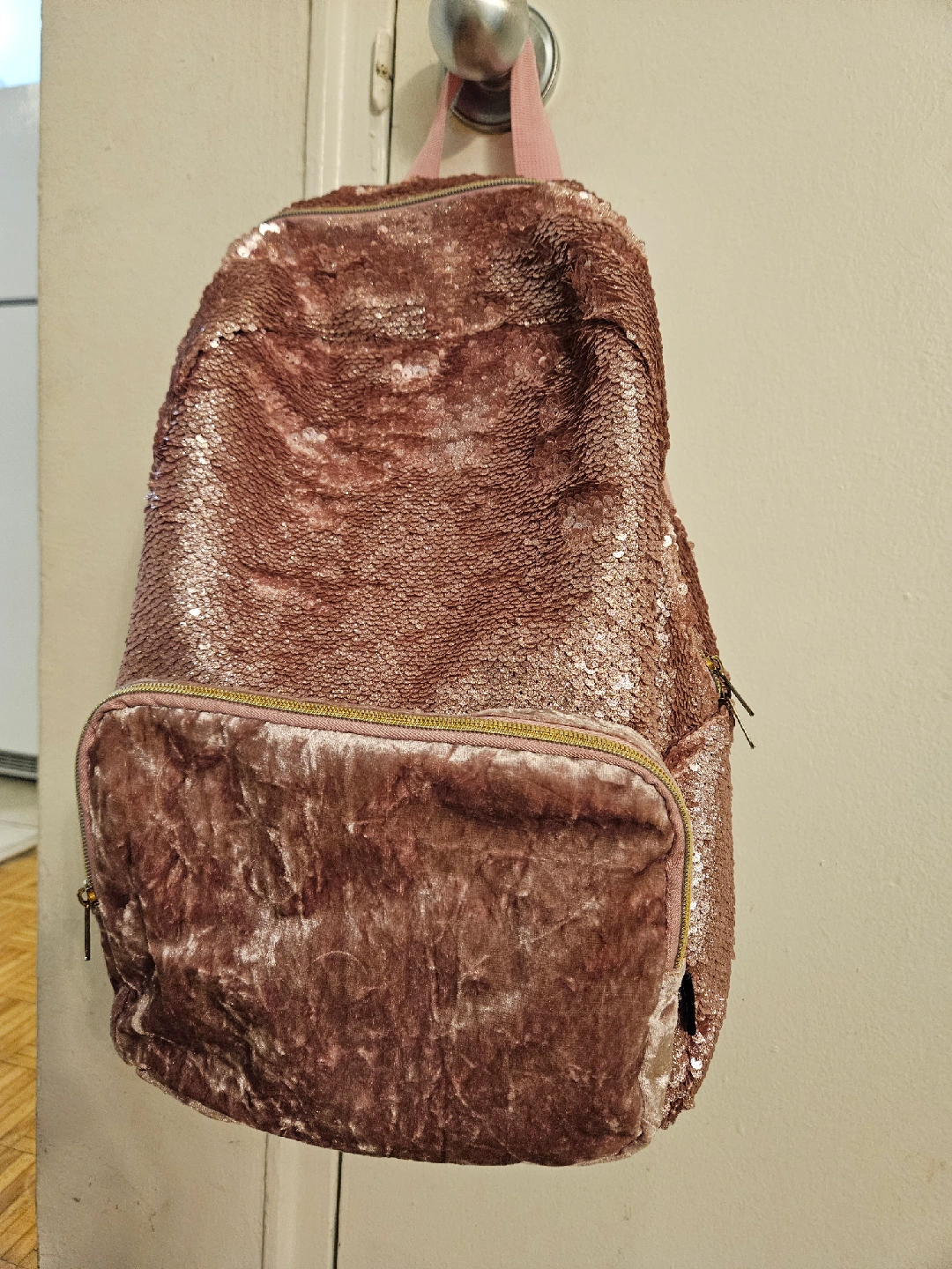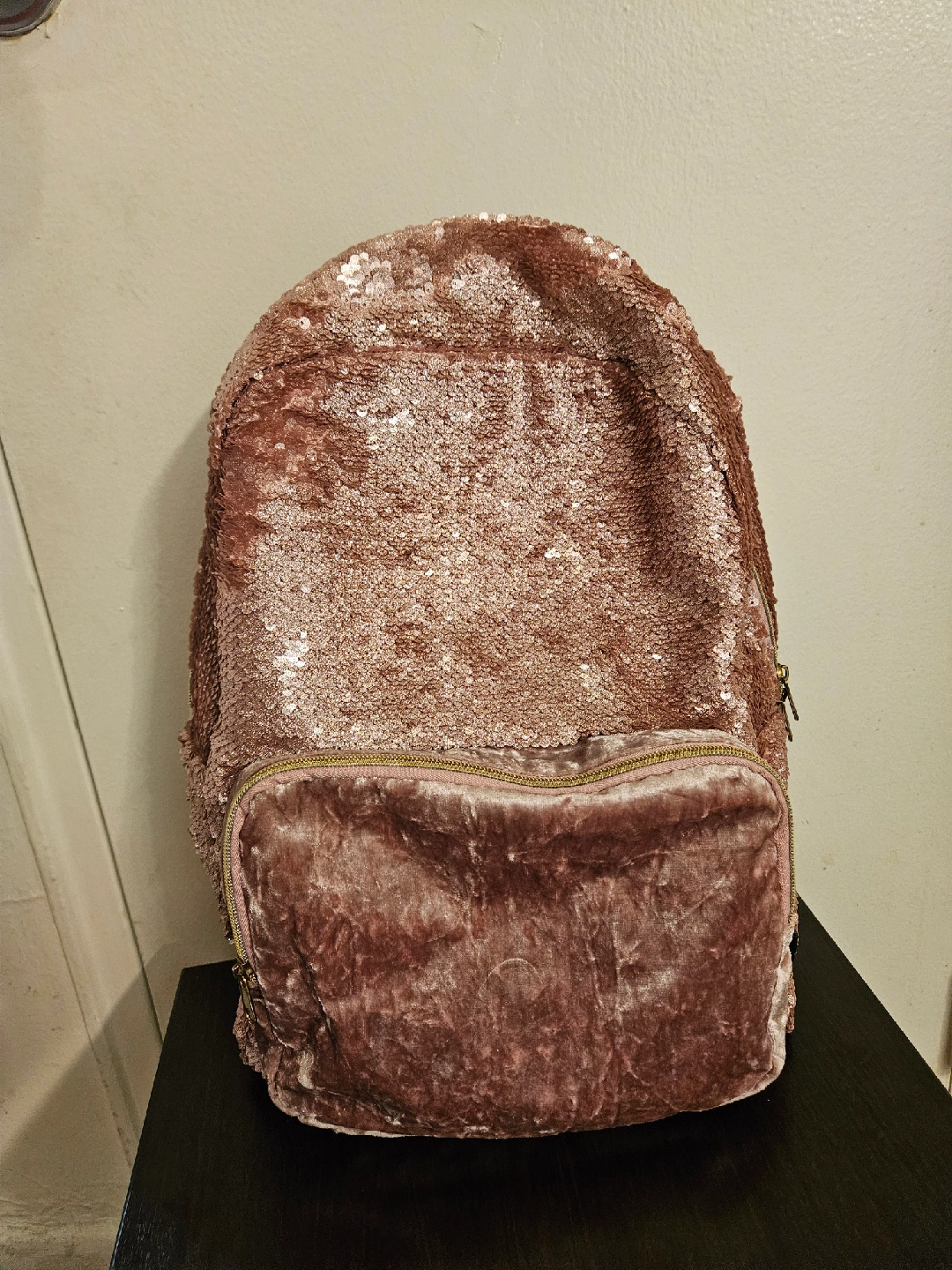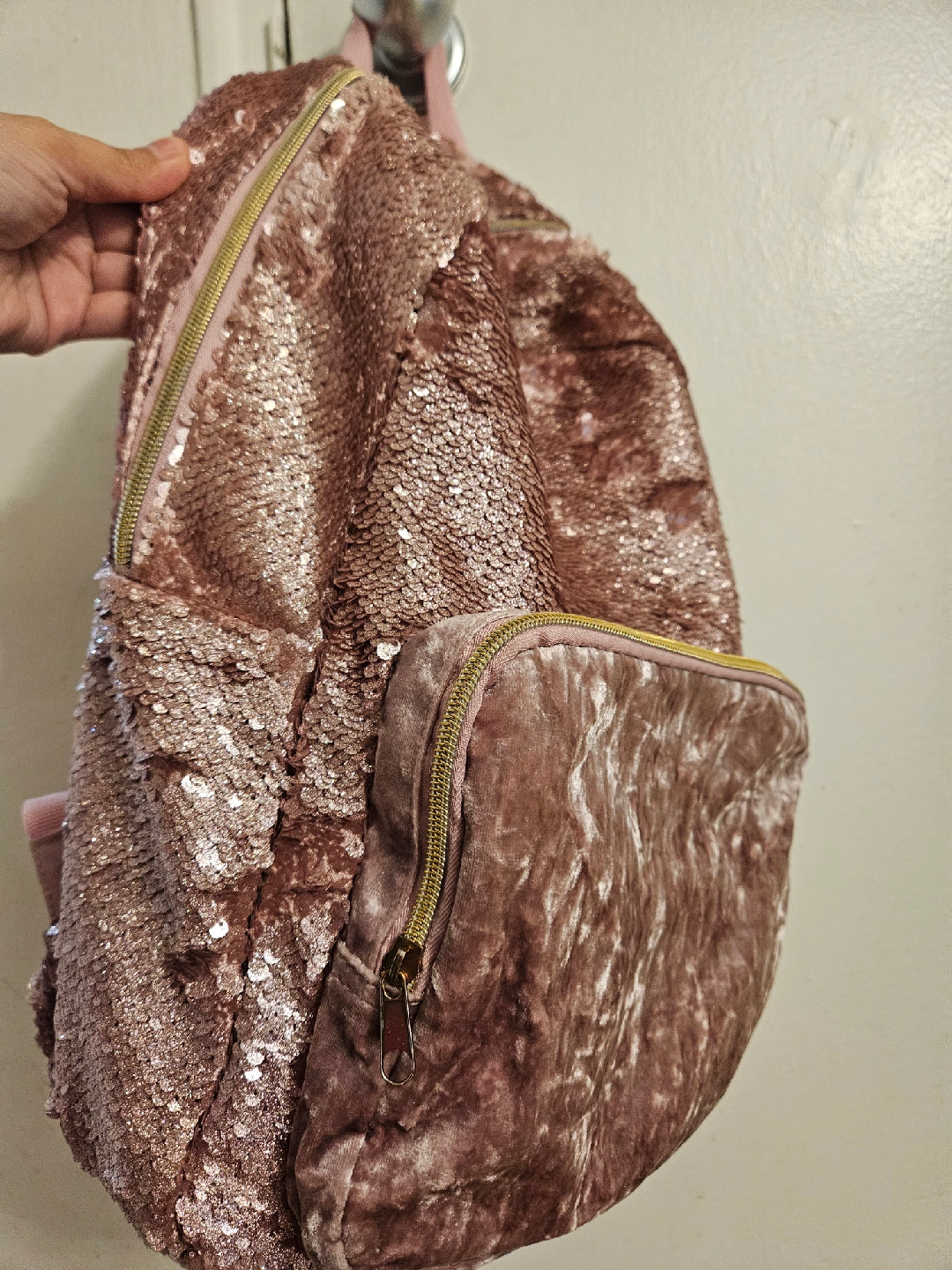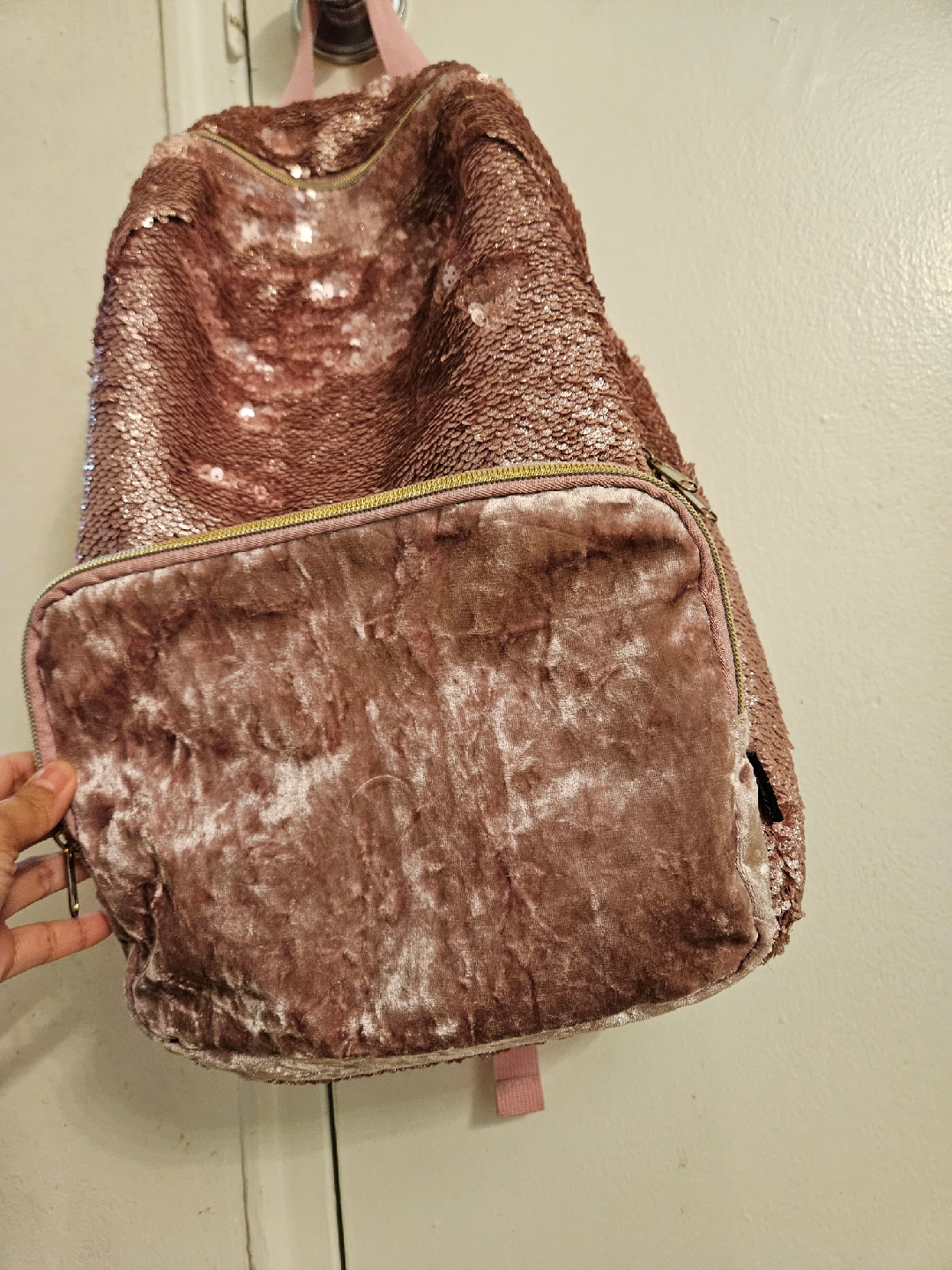 Selling a super cute backpack! It's a rose gold colour with sequins on the top half and velvet on the bottom. Perfect for adding a touch of sparkle to your everyday look or for a night out