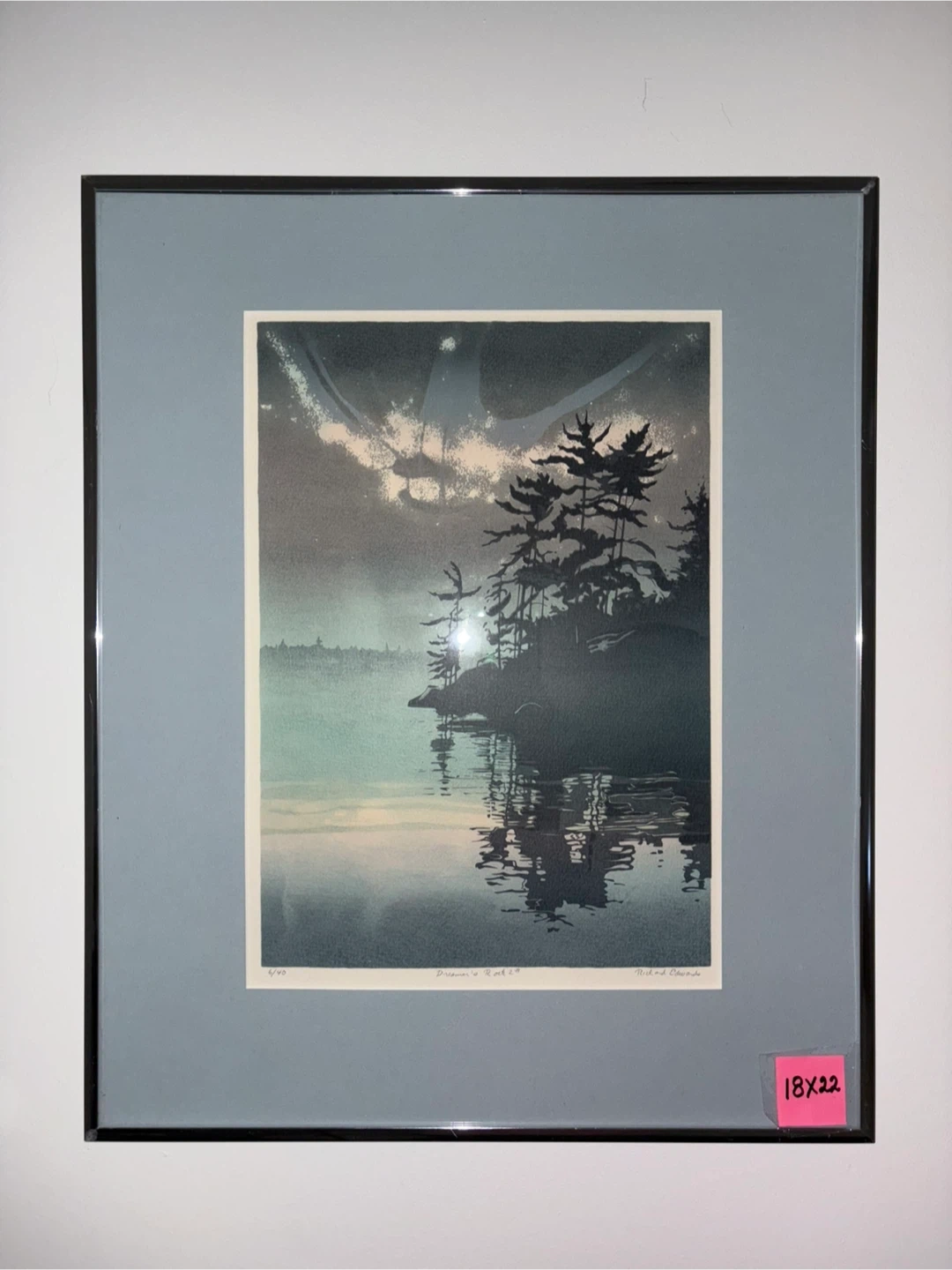 This is a framed art print titled "Dreamer's Rest" by artist Richard G. Adams. The print is numbered 6/90. The framed artwork measures 18x22 inches. It depicts a serene lake scene with trees and reflections.