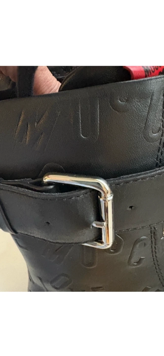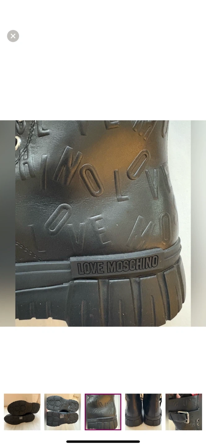 These Love Moschino ankle boots are in great condition! They feature a cool, edgy design with embossed lettering and buckle detailing. Perfect for adding a bit of rock 'n' roll to your wardrobe! Comes without a box. Size 39US.