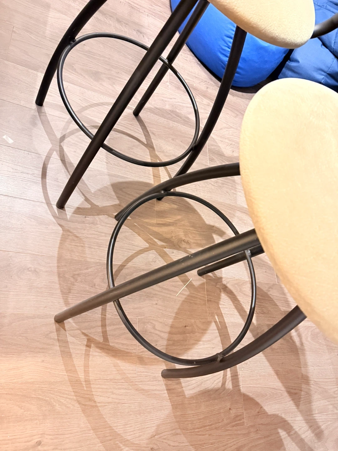 Two bar stools with cream-coloured upholstered seats and black metal frames. These stools feature a swivel function for easy movement. The metal footrests provide added comfort.