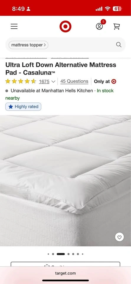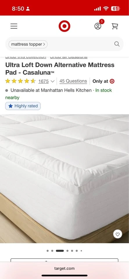 Selling my new mattress topper. Cotton mattress pad with 4-way stretch fitted skirt. Box quilted construction keeps the loft filling from shifting. Firm-density pad with water-repellent qualities. Forms an allergen barrier for enhanced comfort. Fits mattresses up to 20in deep. STANDARD 100 by OEKO-TEX® certified. Add a protective layer to your bed and enjoy all-season comfort with the Ultra-Loft Down-Alternative Mattress Pad from Casaluna™. Suitable for mattresses up to 20 inches deep, this cotton mattress pad keeps your mattress protected from any spills or allergens. It is decorated with a box-quilted pattern and ultra-loft filling for luxurious comfort, along with a four-way stretch skirt that allows the pad to nicely fit your mattress. Plus, it is machine washable to make cleaning a breeze.
