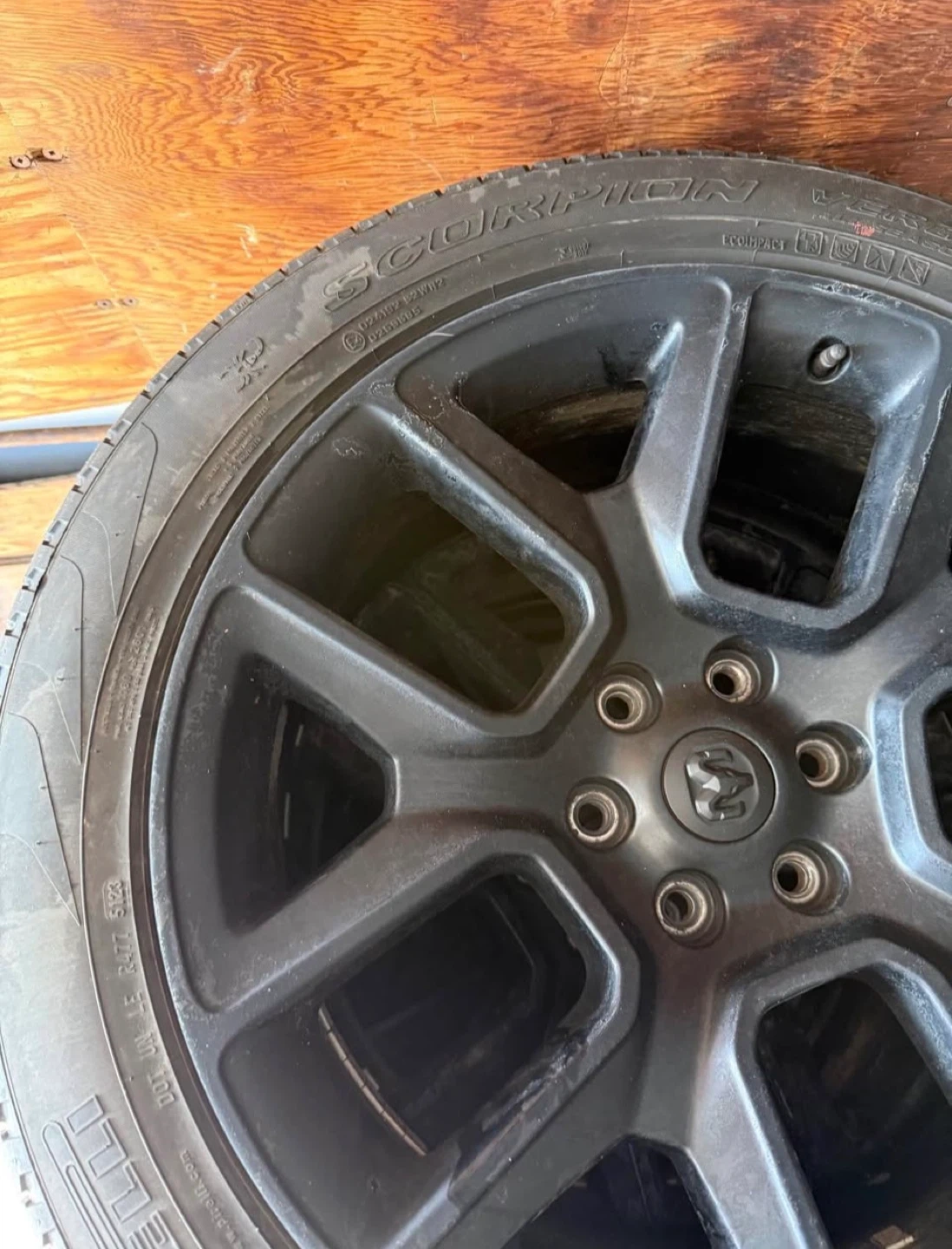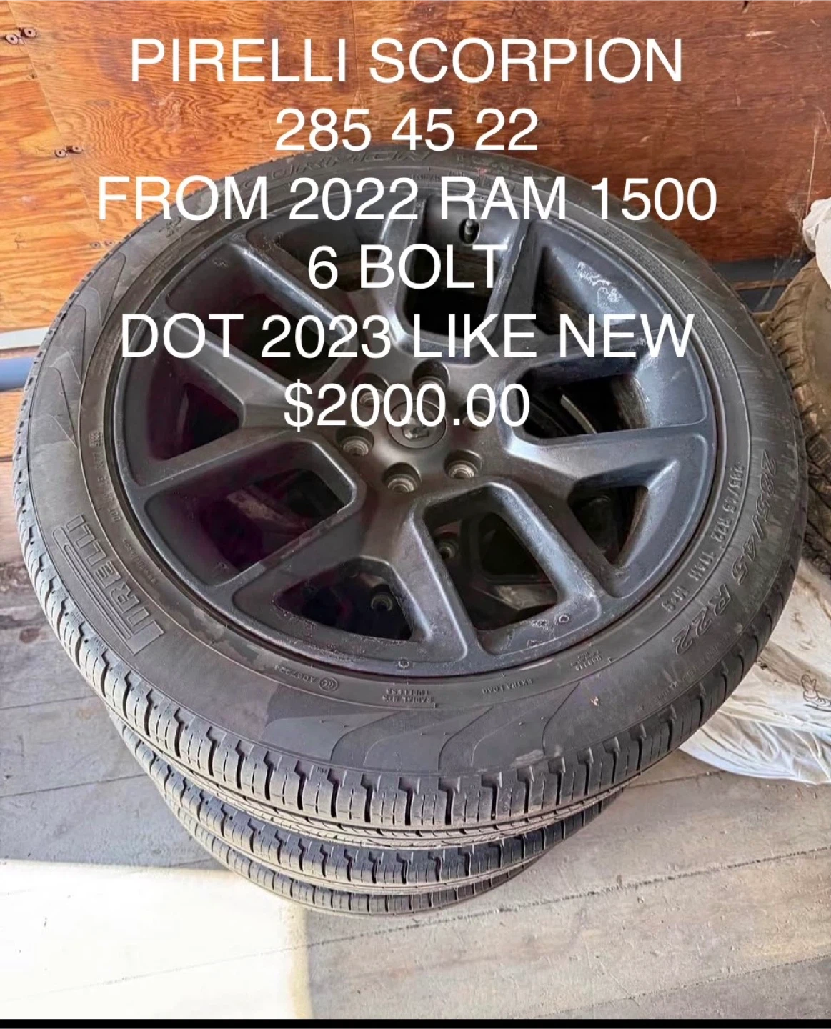 Four Pirelli Scorpion tires, size 285/45 R22. DOT 2023, like new condition. These came off a 2022 Ram 1500. 6 Bolt. They're ready for a new vehicle!