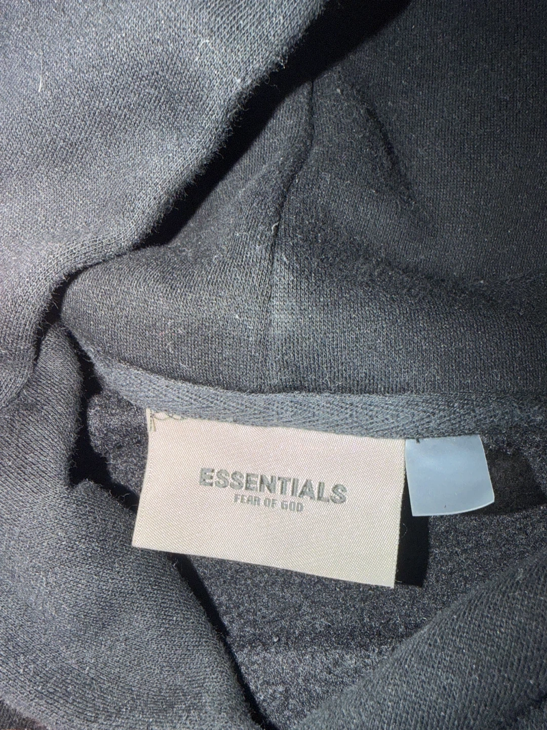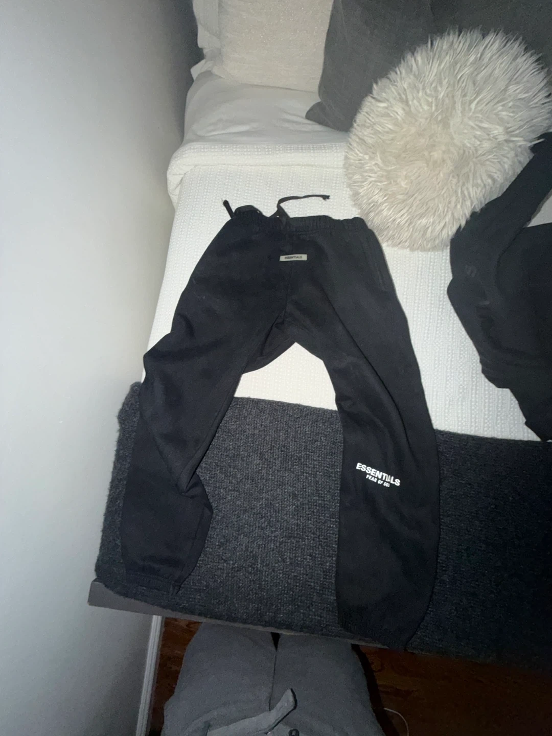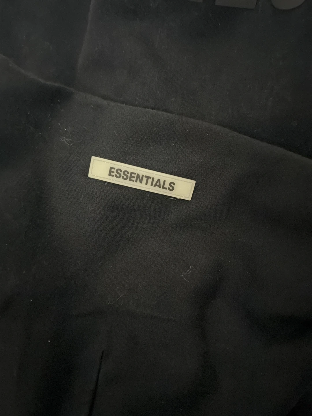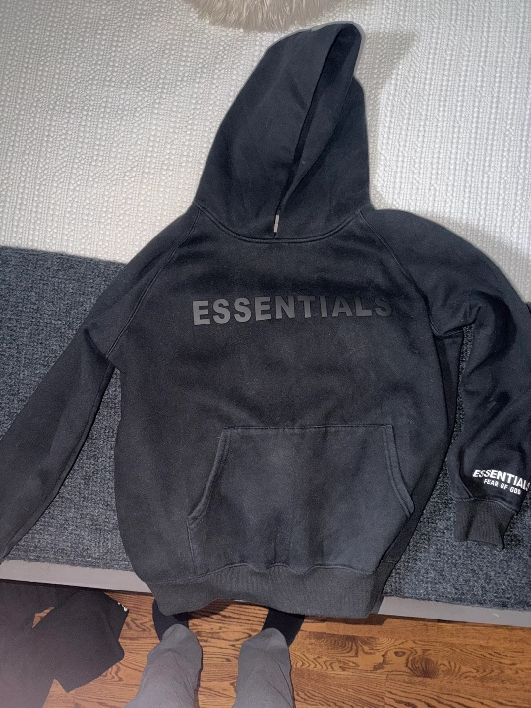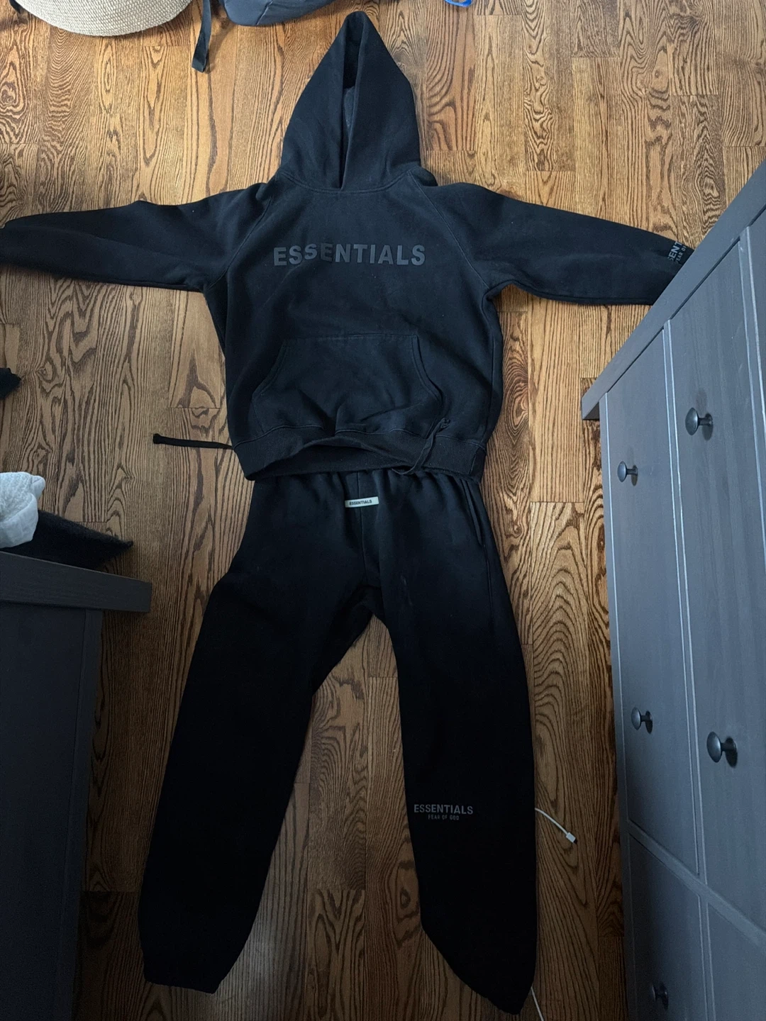 This is a black reflective Essentials hoodie and sweatpants set. The hoodie has a front pocket and drawstring hood. The sweatpants are also black with a drawstring waist. Both pieces are made from a comfortable material, perfect for casual wear.