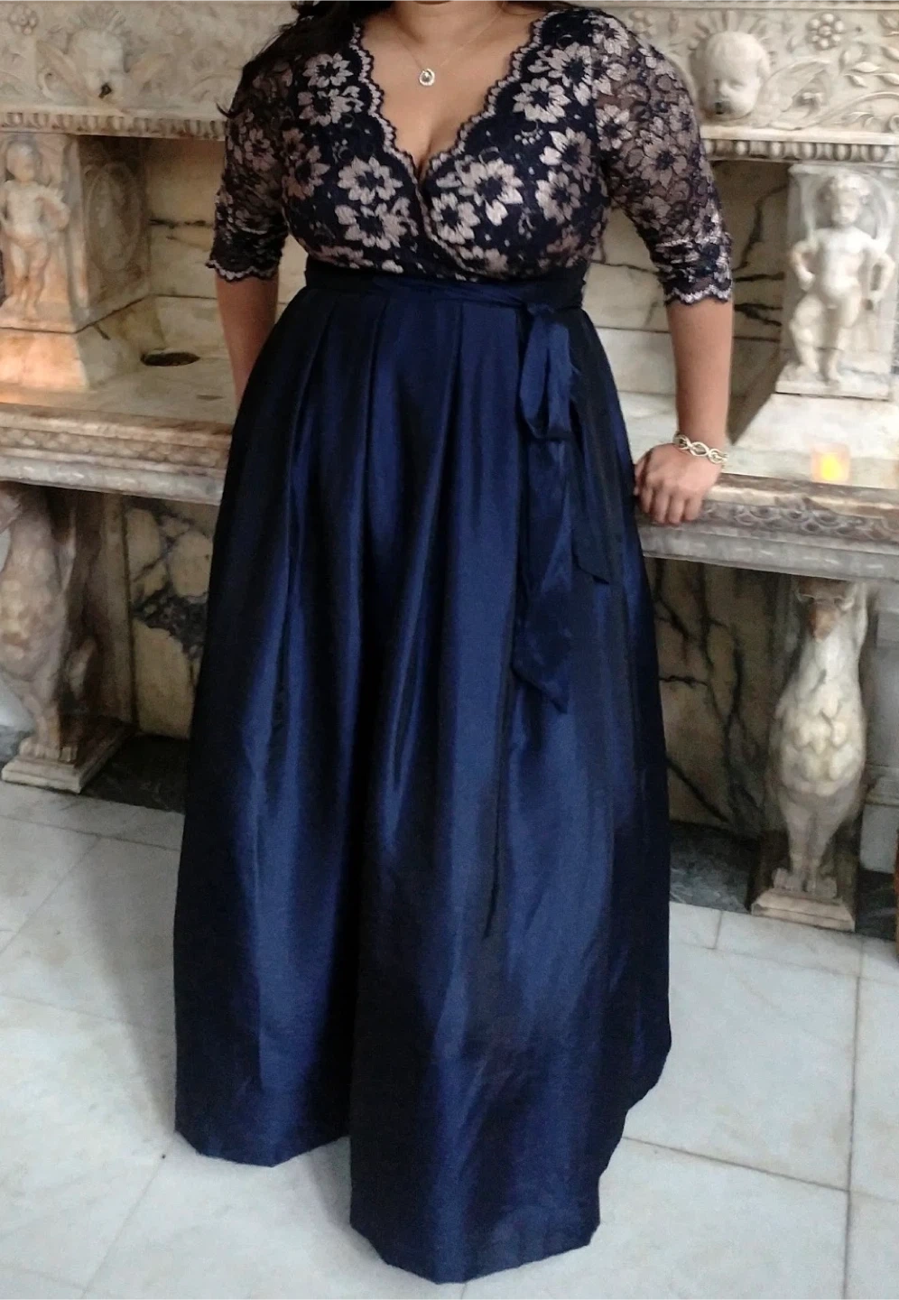 David’s bridal ball gown- Beautiful navy blue maxi dress with a delicate lace overlay on the bodice and sleeves. It features a flattering wrap-style top and a full, flowing skirt with a tie waist with pockets! Perfect for formal events or evening wear!