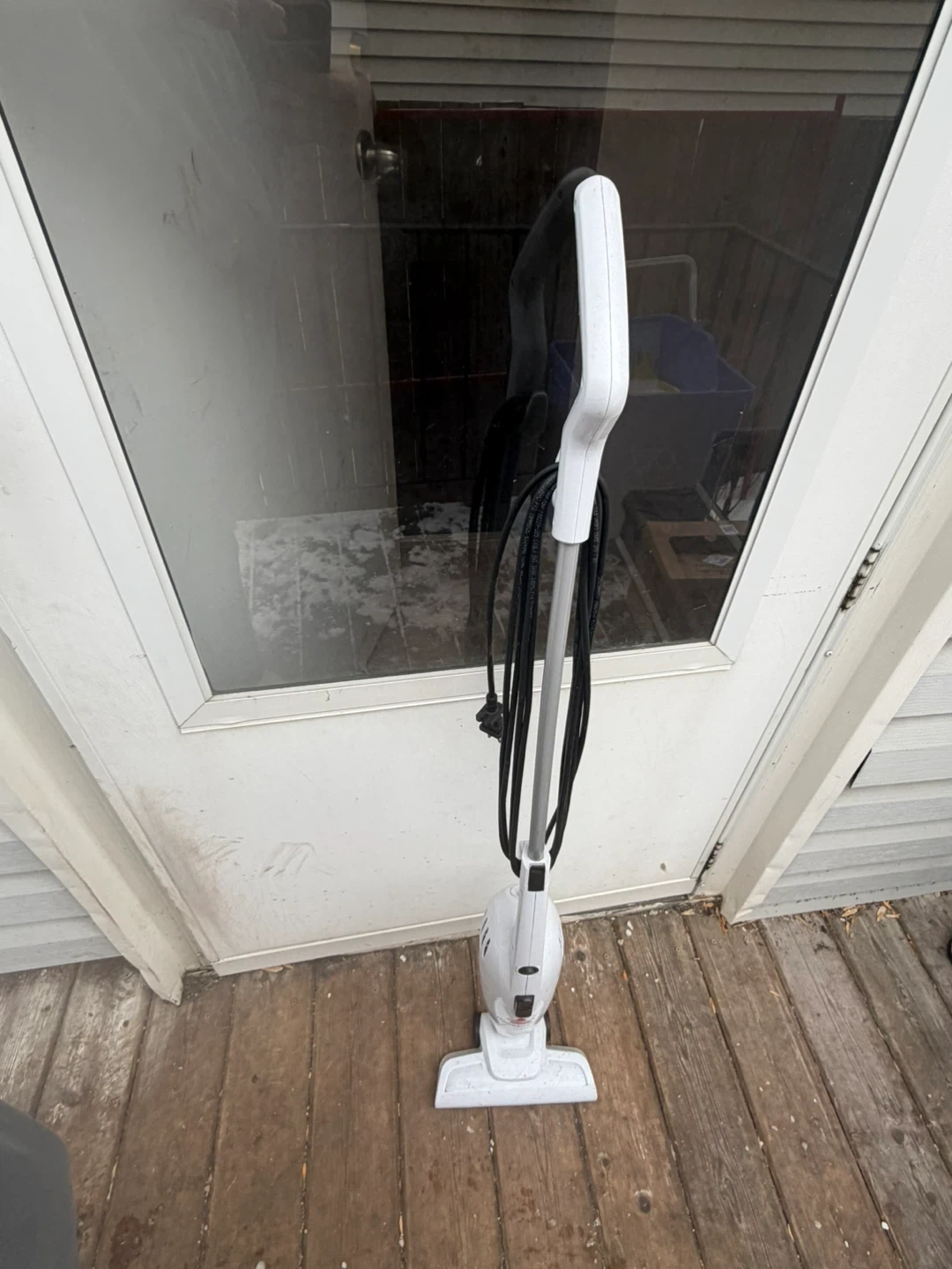 This is a white stick vacuum cleaner with a cord. It's lightweight and easy to manoeuvre. It's suitable for quick cleanups.
