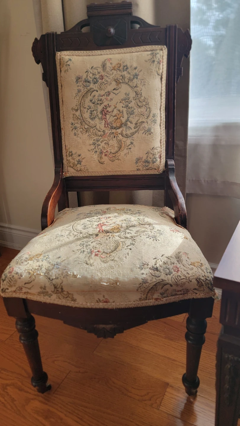 This set includes two vintage accent chairs with ornate fabric upholstery and a matching wooden side table. The chairs have intricate patterns on the seats and backs. The side table is made of dark wood and features a lower shelf.