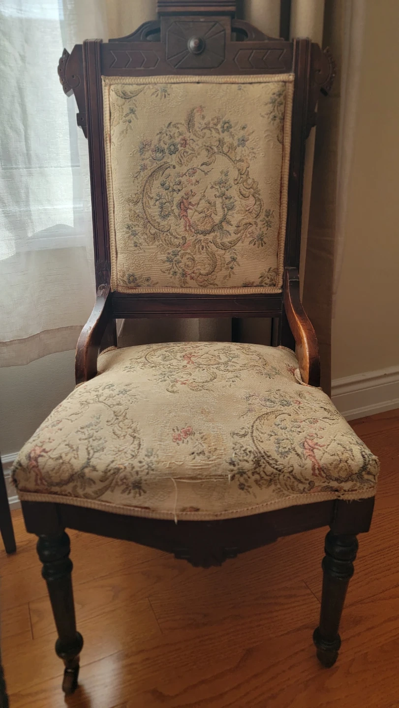 This set includes two vintage accent chairs with ornate fabric upholstery and a matching wooden side table. The chairs have intricate patterns on the seats and backs. The side table is made of dark wood and features a lower shelf.