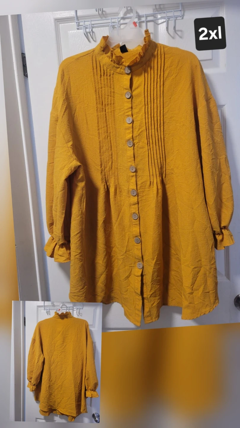 A lovely mustard yellow blouse, perfect for adding a pop of colour to your wardrobe! It features a unique ruffle neckline and button-down front. The size is 2XL.