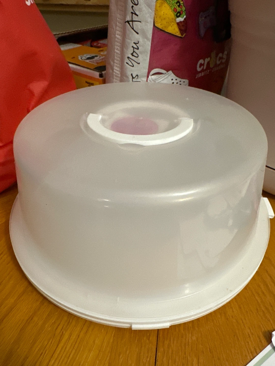This is a clear plastic cake carrier with a white base and a dome lid. It's designed to safely transport and store cakes. The lid has a convenient carrying handle on top.