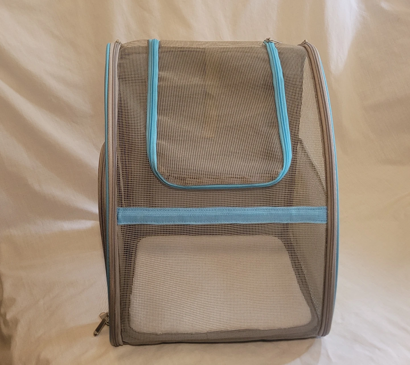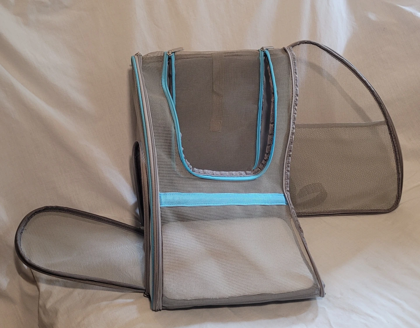Mesh pet carrier bag with zippers. Features breathable mesh sides for ventilation. It has top and side openings for easy pet access.