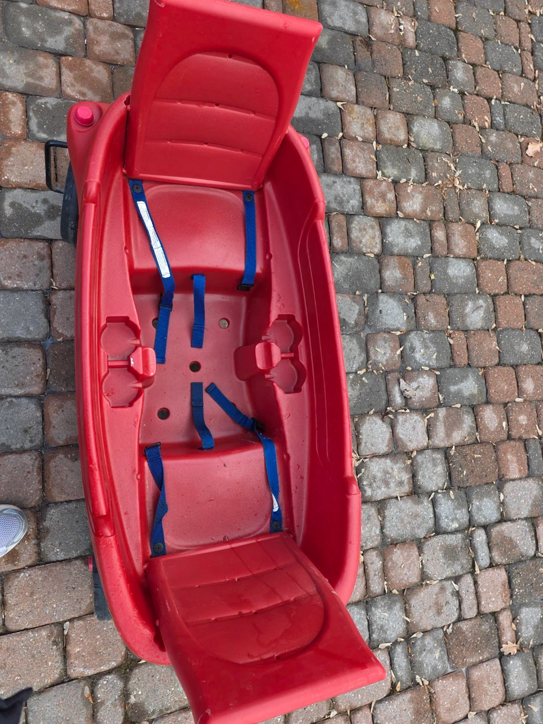 A red Radio Flyer wagon with a sturdy plastic body and four wheels. It has a pull handle and seatbelts for added safety. This wagon is perfect for hauling toys or groceries!