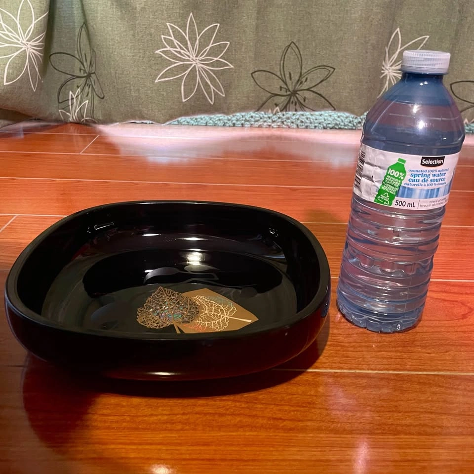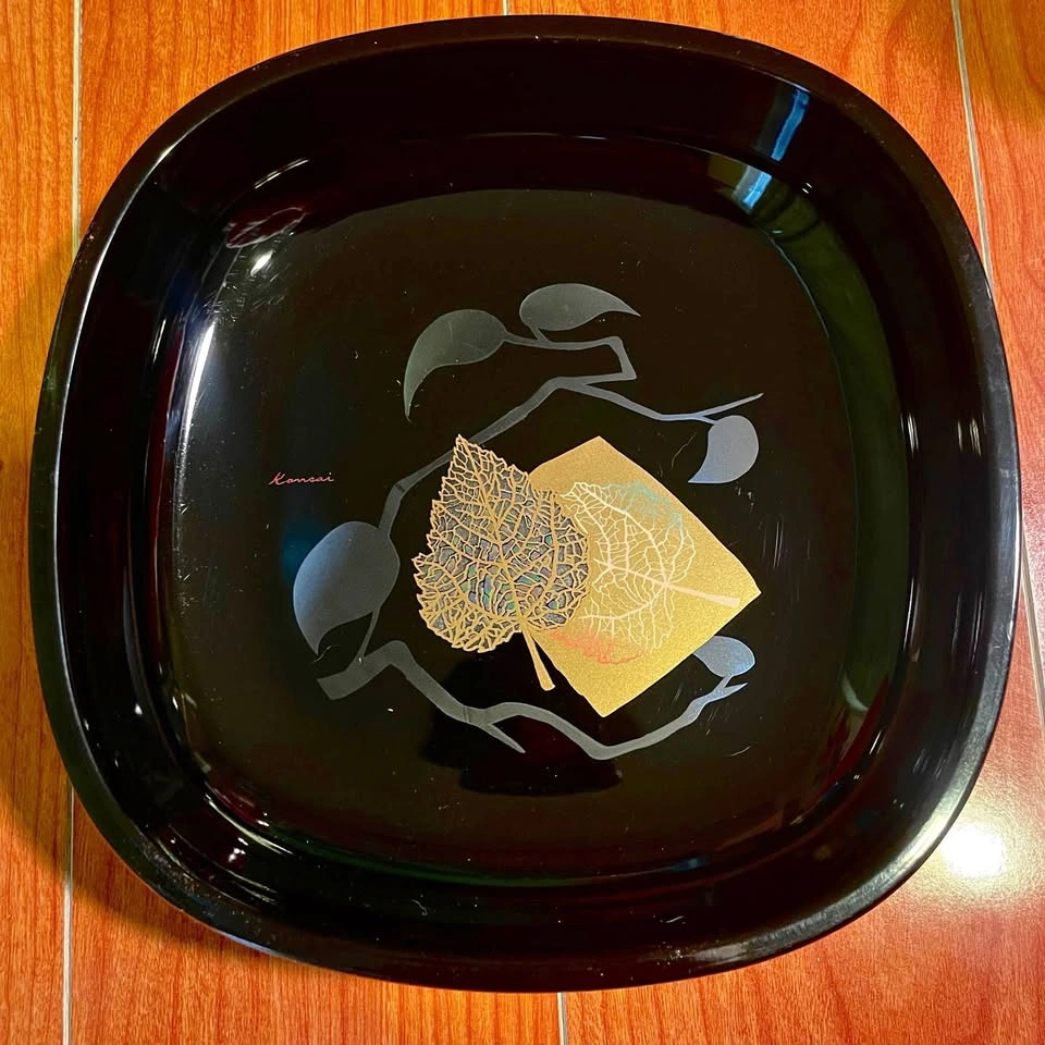 A beautifully crafted lacquerware candy dish designed by Kansai Yamamoto, featuring a glossy black finish with a delicate “Tama-ha” leaf pattern that glows softly like stained glass. Perfect for serving sweets to guests or for everyday use.