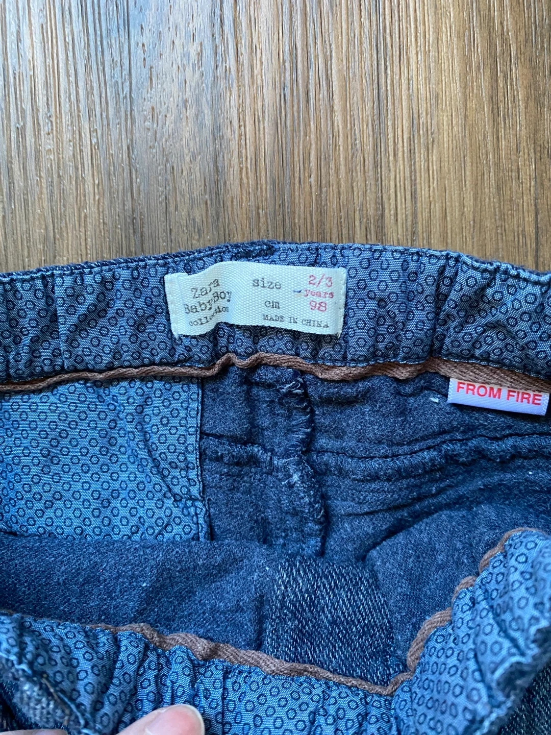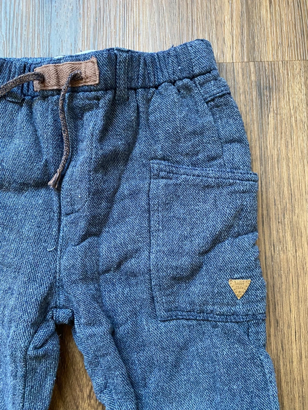 Zara baby boy cargo pants in blue/grey. Size 2/3 years (98 cm). Made in China. These pants have an elastic waistband with a drawstring and cargo pockets. No fabric care tag, however it feels like wool blend