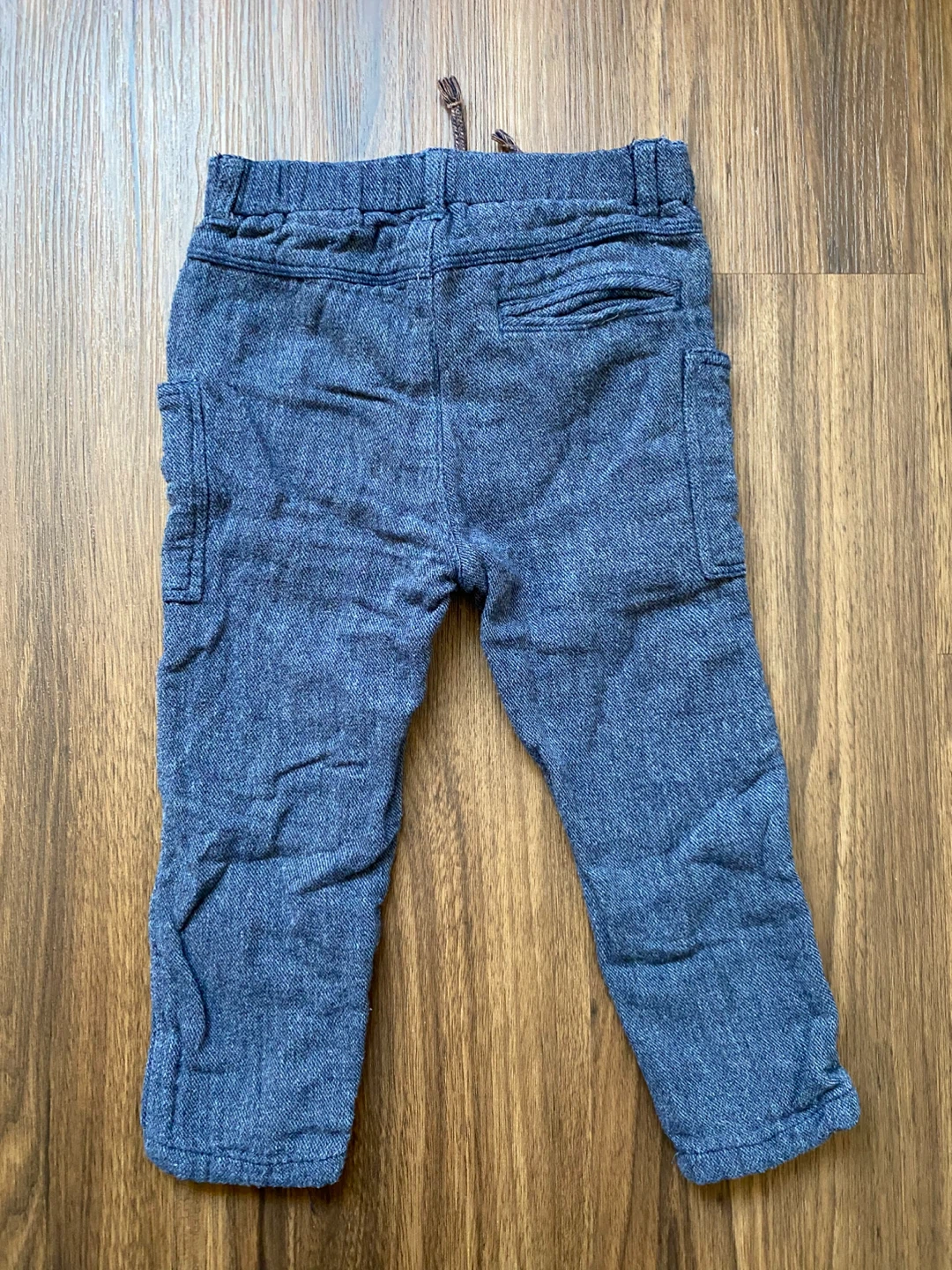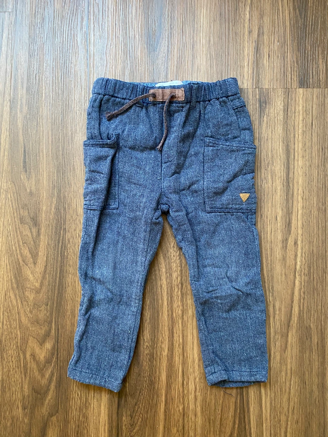 Zara baby boy cargo pants in blue/grey. Size 2/3 years (98 cm). Made in China. These pants have an elastic waistband with a drawstring and cargo pockets. No fabric care tag, however it feels like wool blend