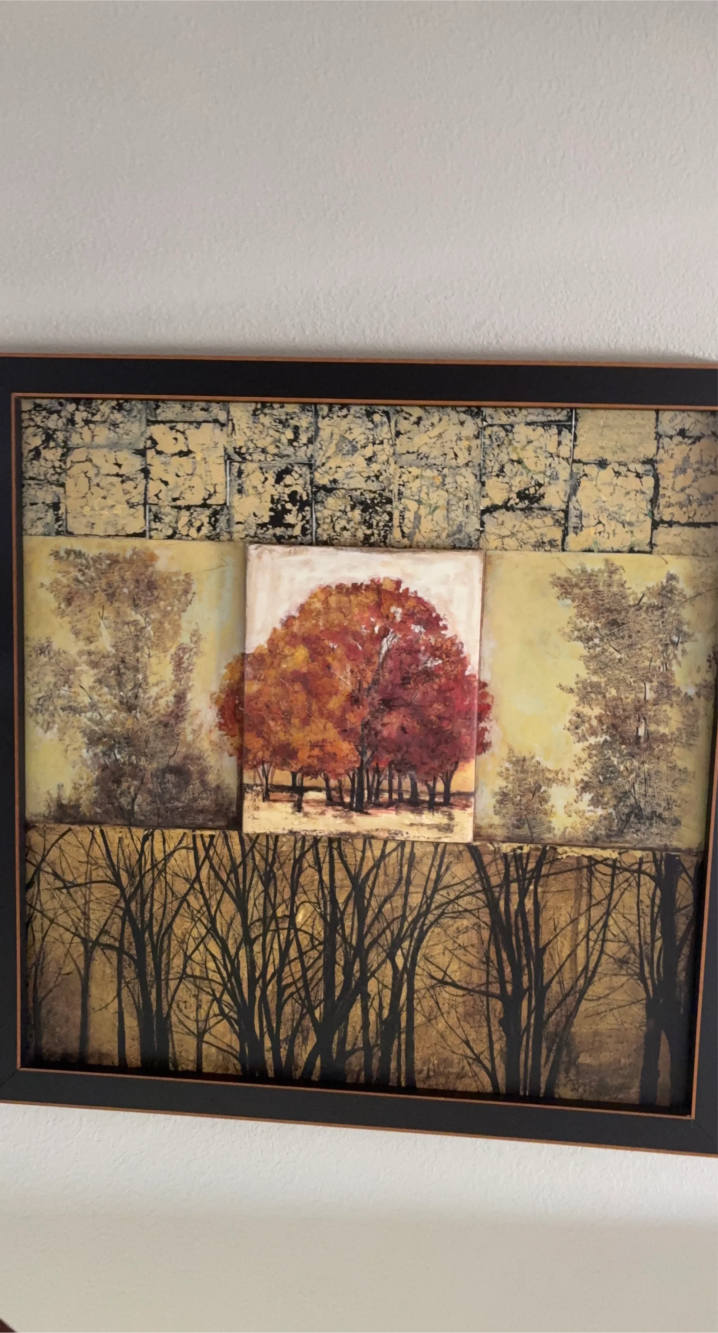 This framed wall art features a vibrant autumn landscape with richly coloured trees. The piece has a layered design with a textured background. It's ready to hang and would add a touch of nature to any room.