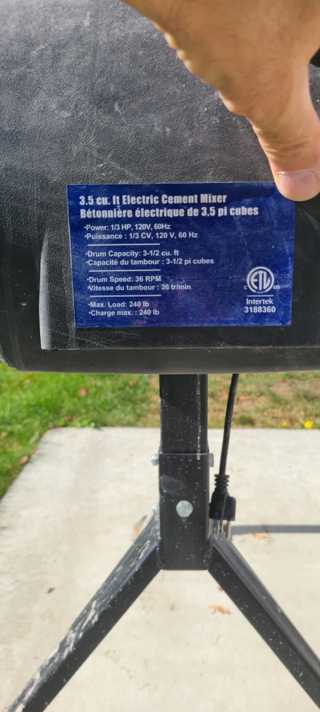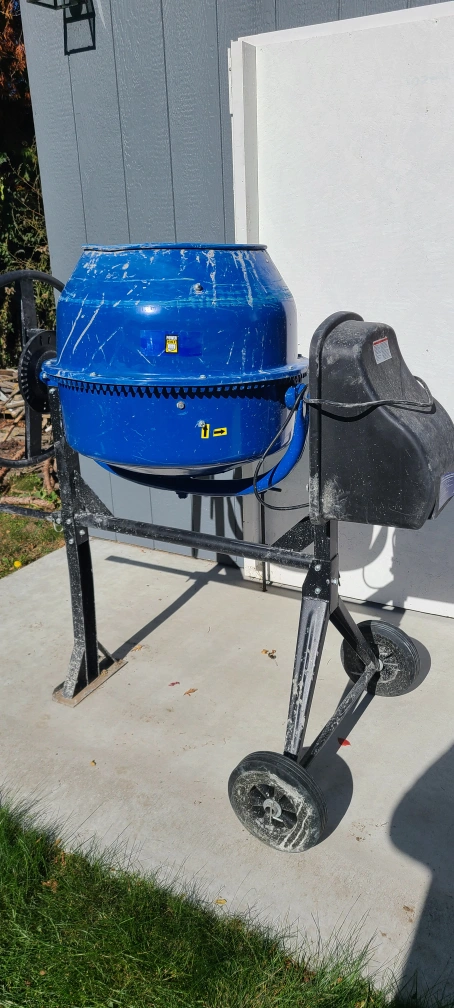 Selling a 3.5 cu. ft electric cement mixer. It's in used condition but still works great for mixing cement. Used it only three times to mix 30 to 40 bags each time. works well ,good for home projects. Specs: -Power: 1/3 HP, 120V, 60Hz -Drum Capacity: 3-1/2 cu. ft -Drum Speed: 36 RPM -Max Load: 240 lb