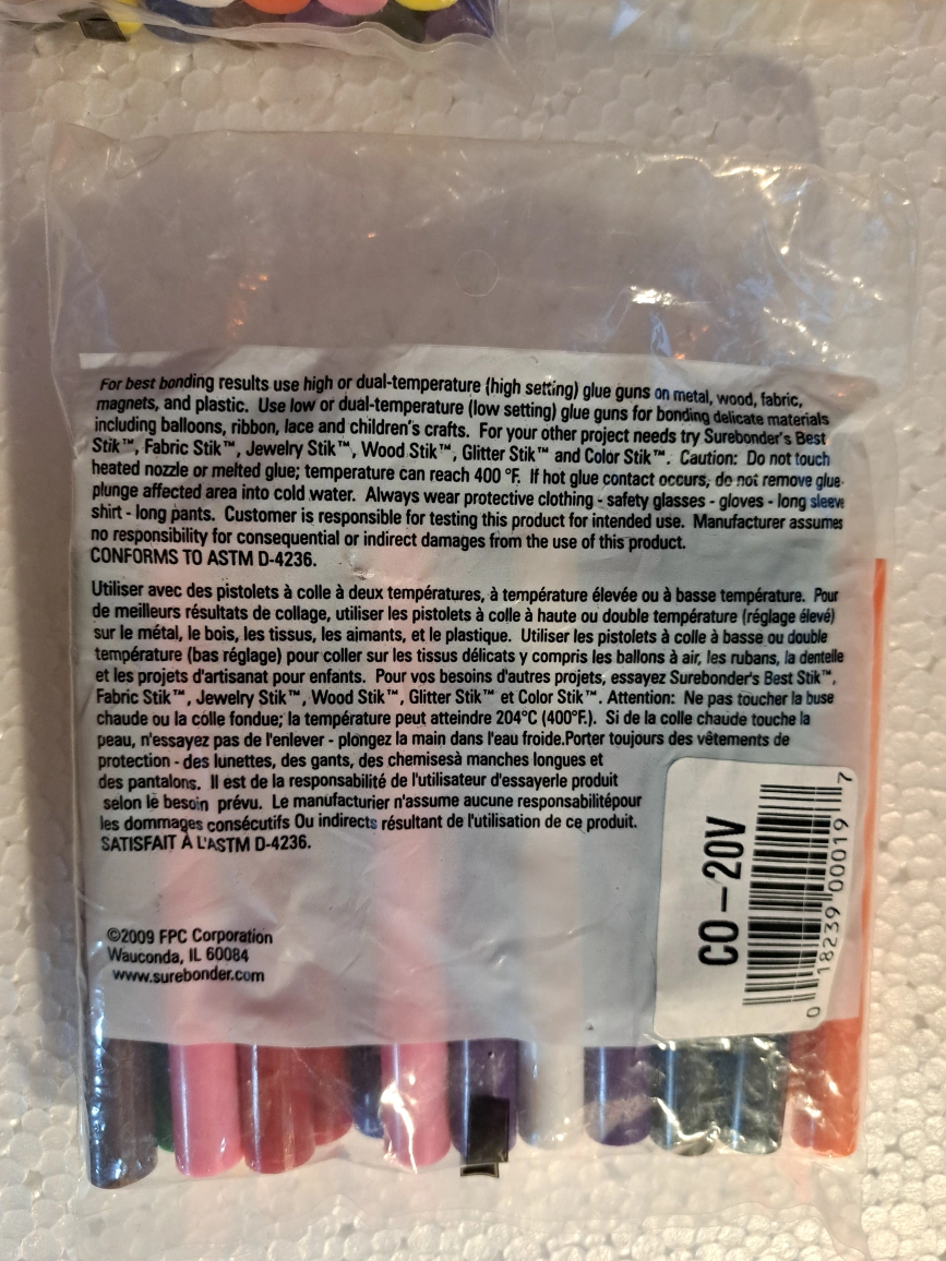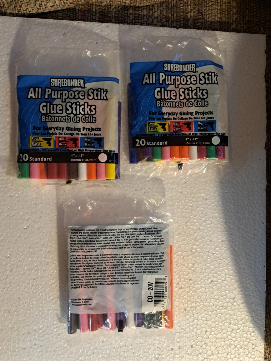 112Price is for all three bags Each bag contains 2 each of black, white, pink, red, orange, yellow, green, blue, purple, and brown glue sticks