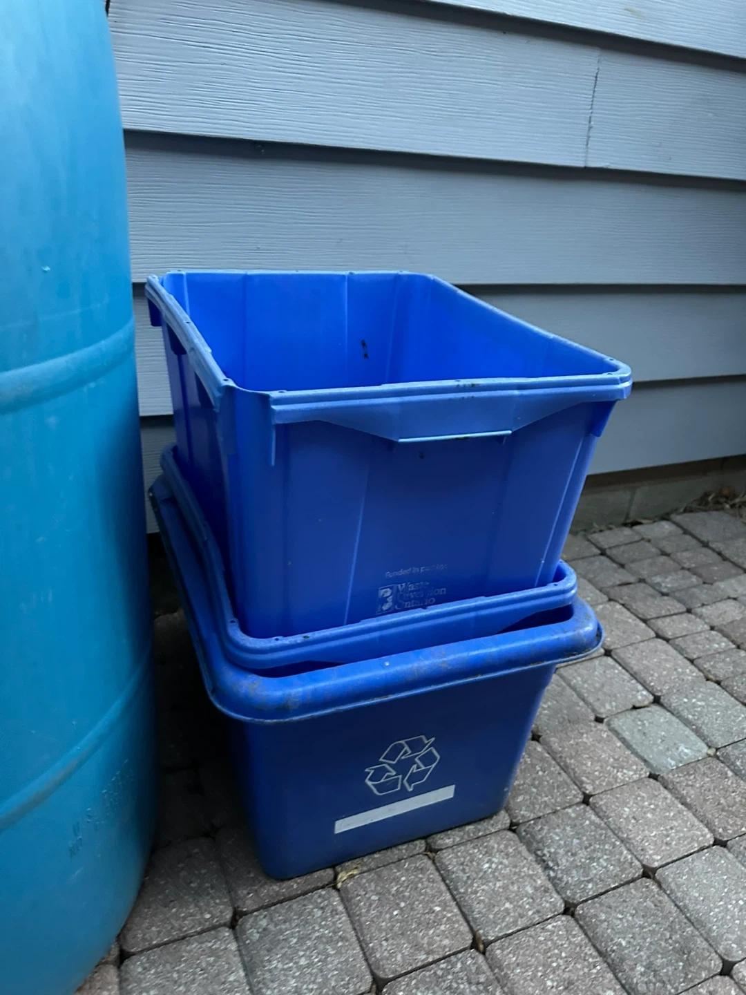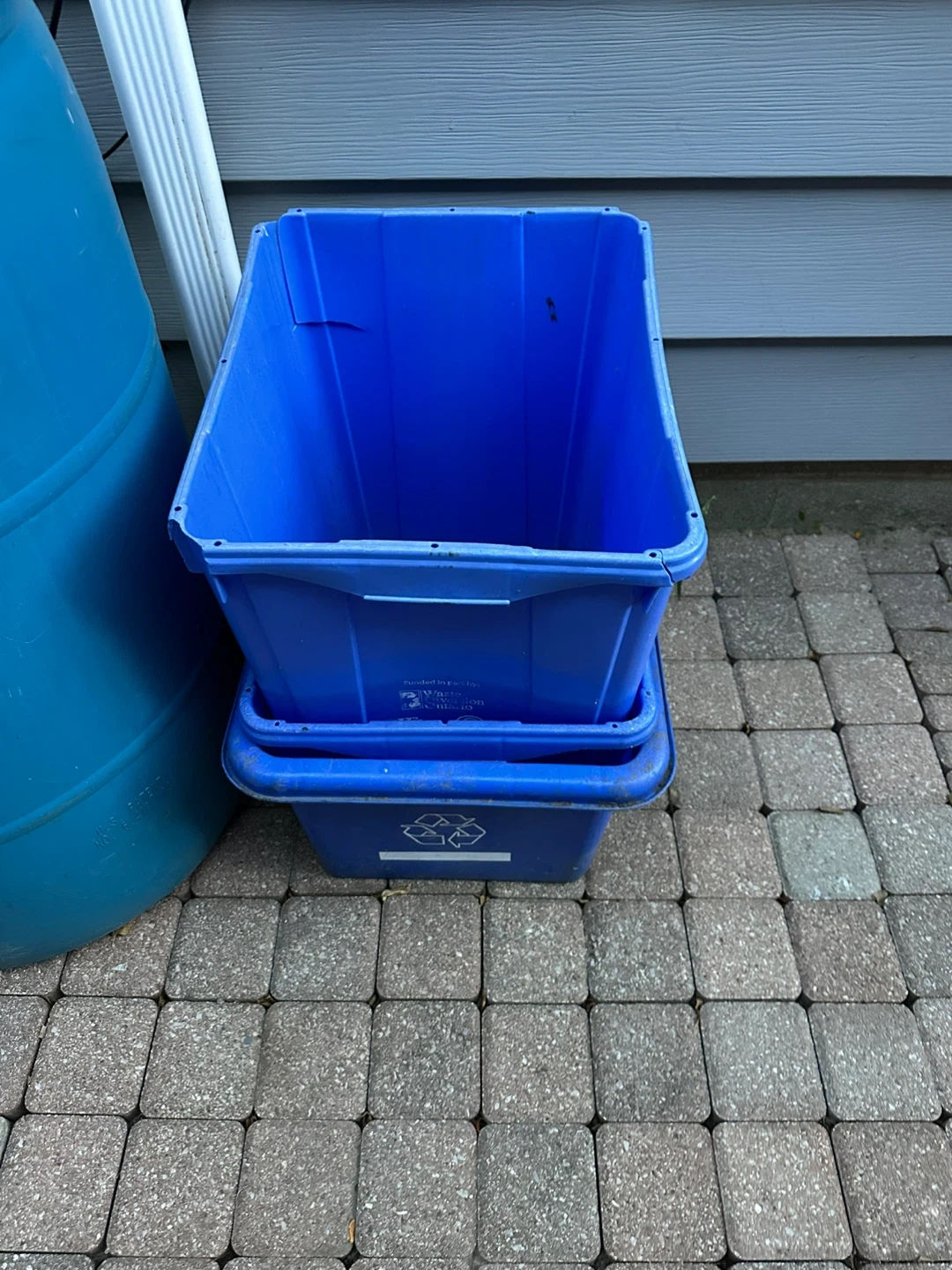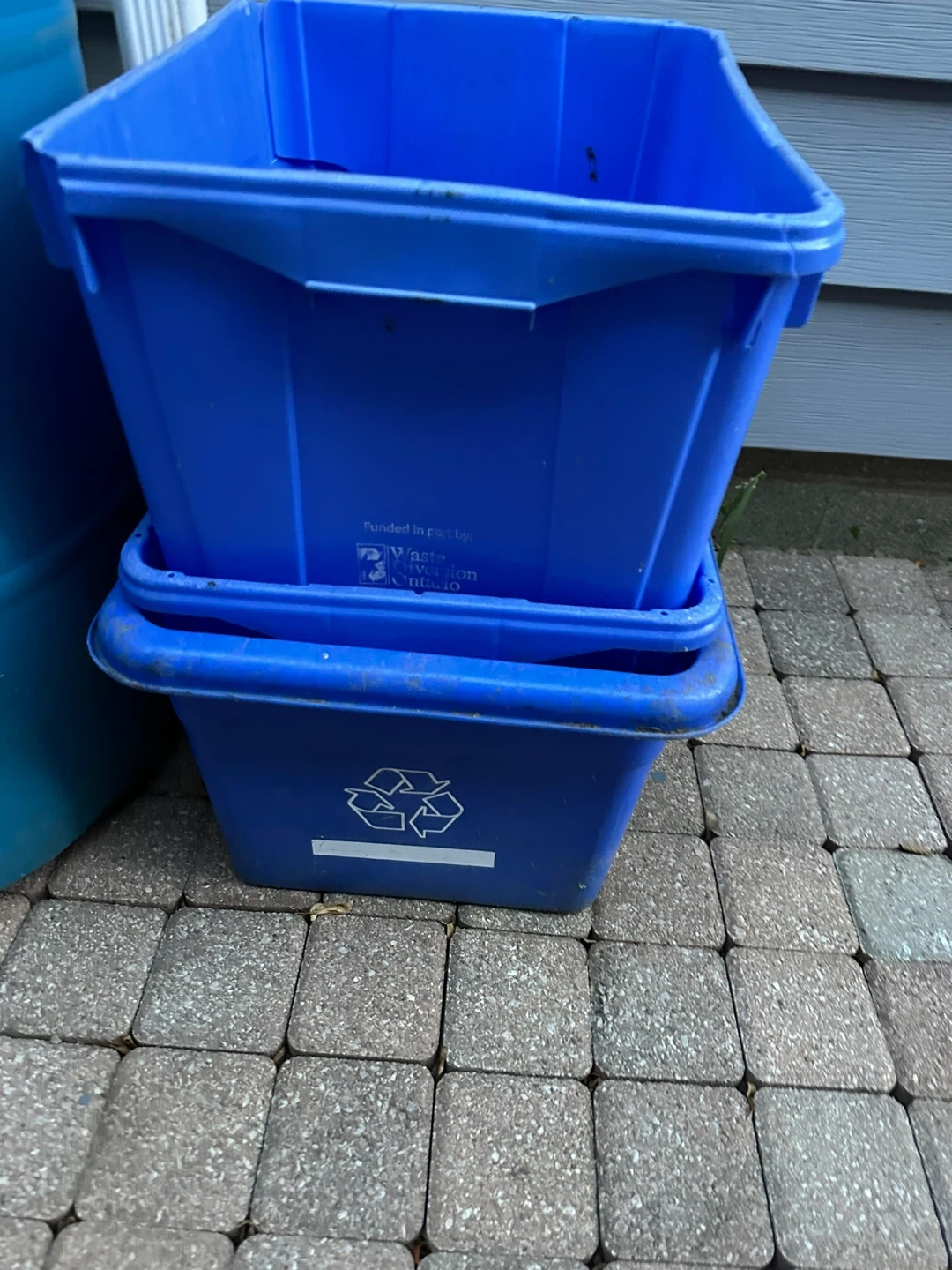 1015$ each 3 blue recycling bins, perfect for keeping your recyclables organized! They're in used condition but still have plenty of life left. Great for home or garage use
