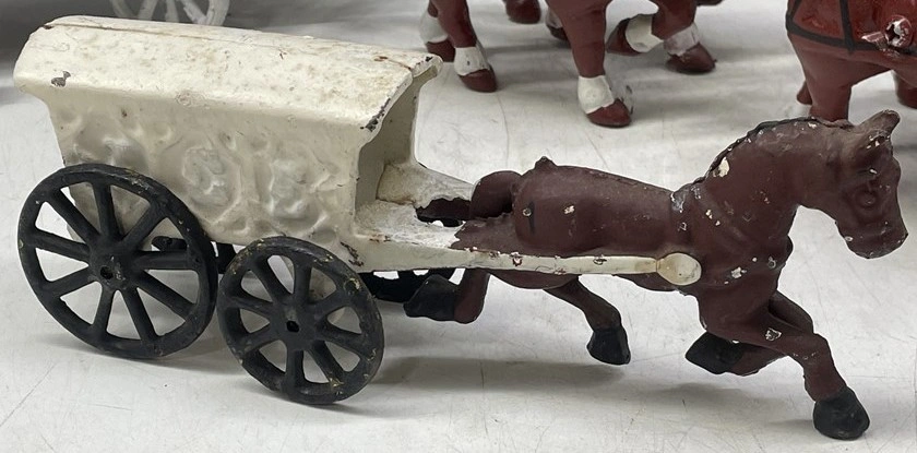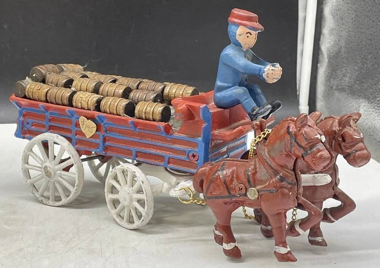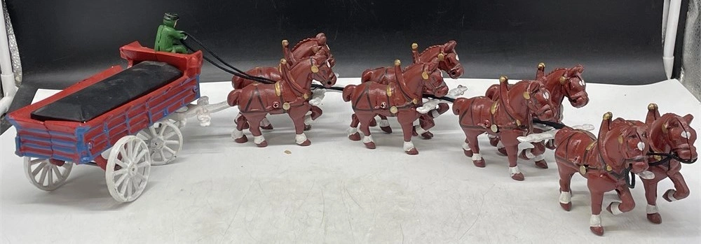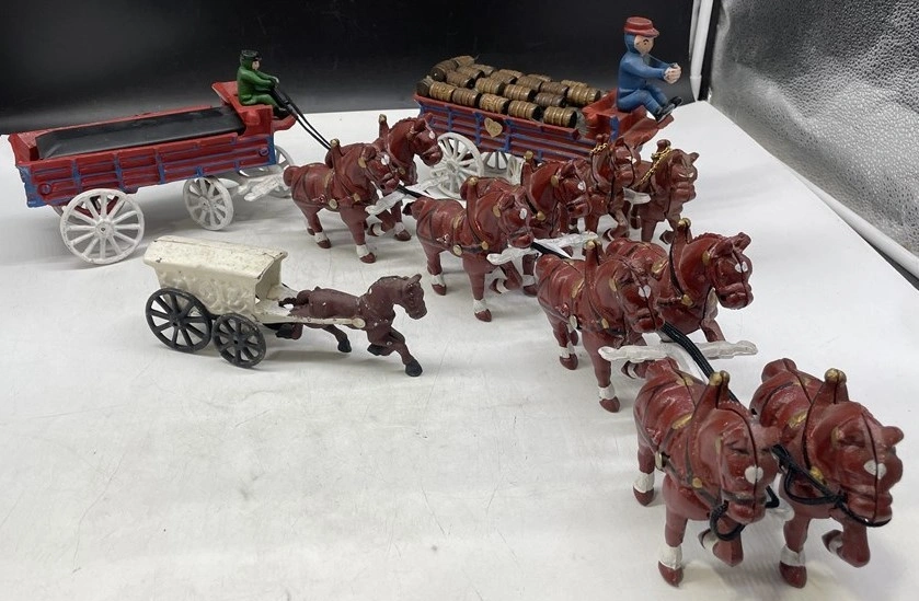 653 Cast Iron Clydesdale Wagons – Budweiser Style (Longest 30”) E-Transfers Accepted Pick Up Anytime Three vintage cast iron horse-drawn wagons, each with classic hand-painted details. Great display or collectible pieces. Individual Items: Red & Blue Wagon with barrels & driver – $135 CAD Red & Green Wagon with extended horse team (30”) – $185 CAD White Wagon with single horse – $55 CAD Take all 3 for $295 CAD (discounted group price). Condition: All in good vintage condition with some paint wear. Solid cast iron construction, heavy and durable. Perfect for collectors of vintage cast iron toys, Budweiser/Clydesdale memorabilia, or Americana display pieces. cast iron horse wagon, Budweiser beer wagon, Clydesdale wagon, antique toy carriage, Americana cast iron toy, vintage wagon collectible