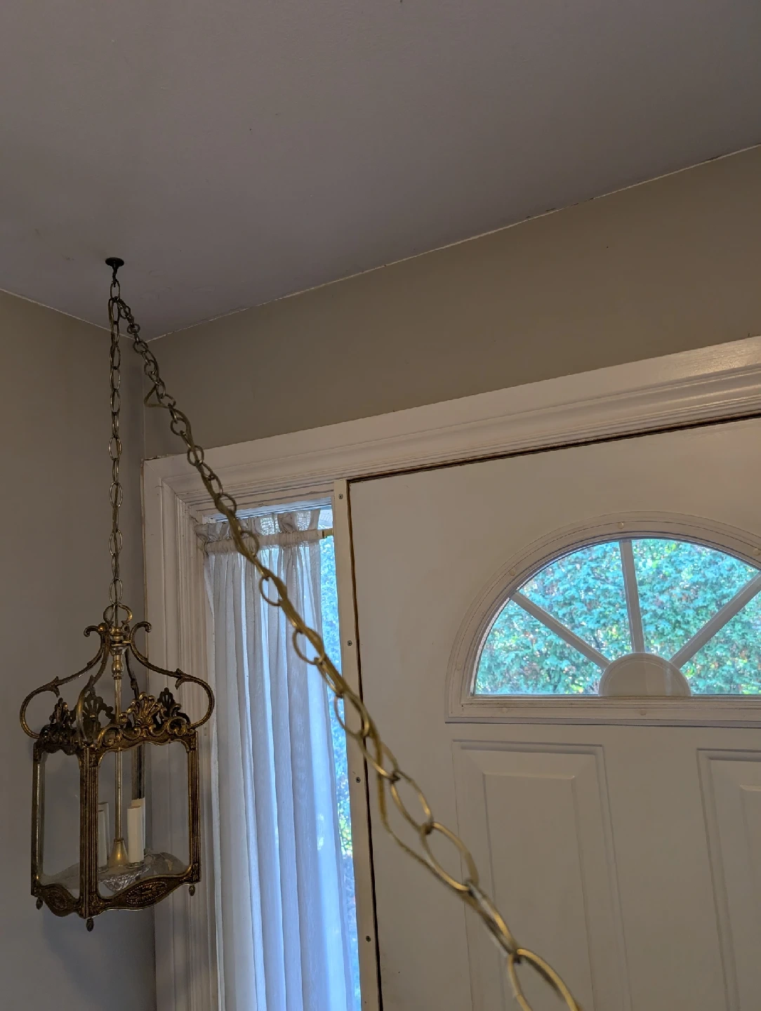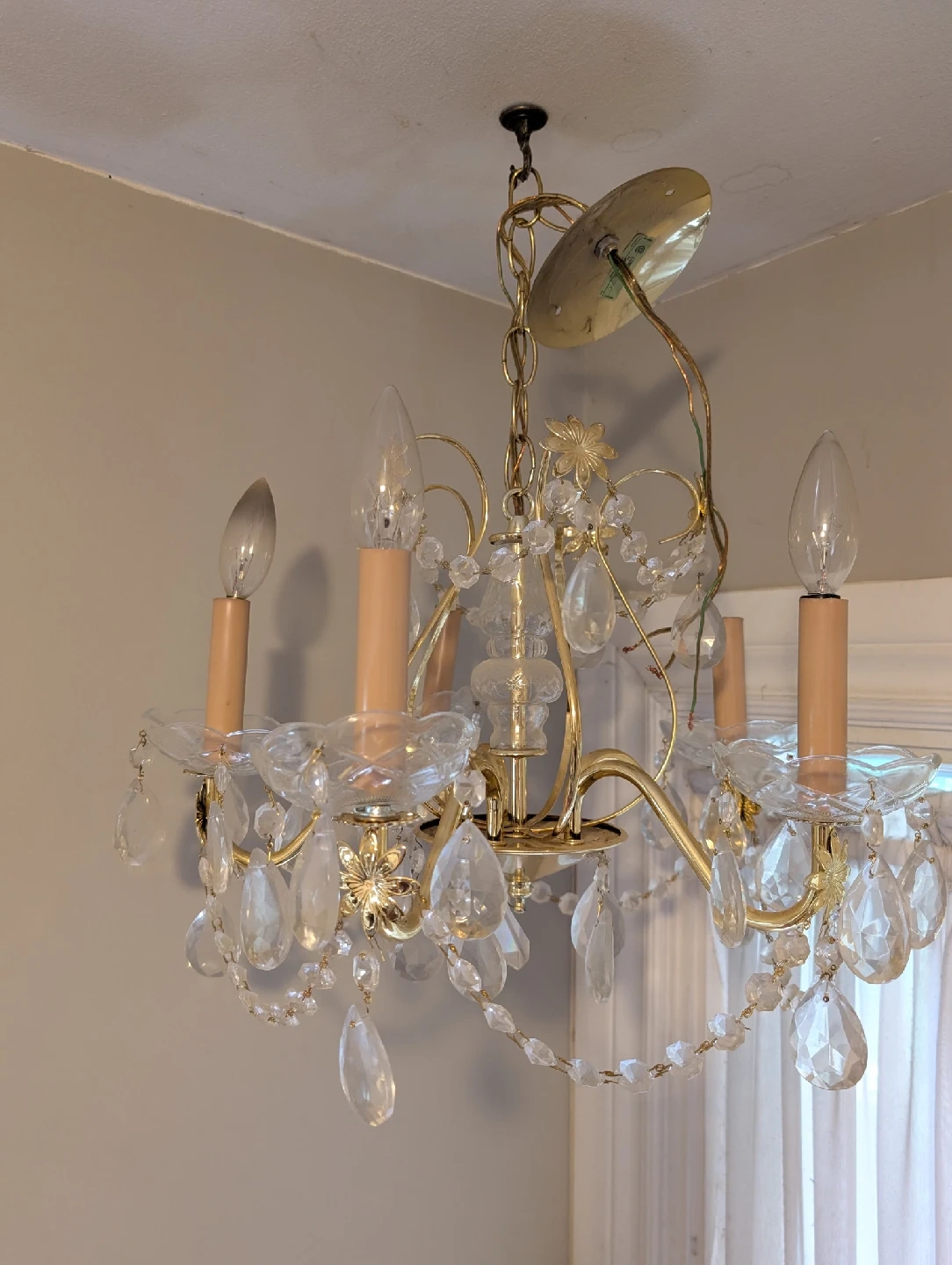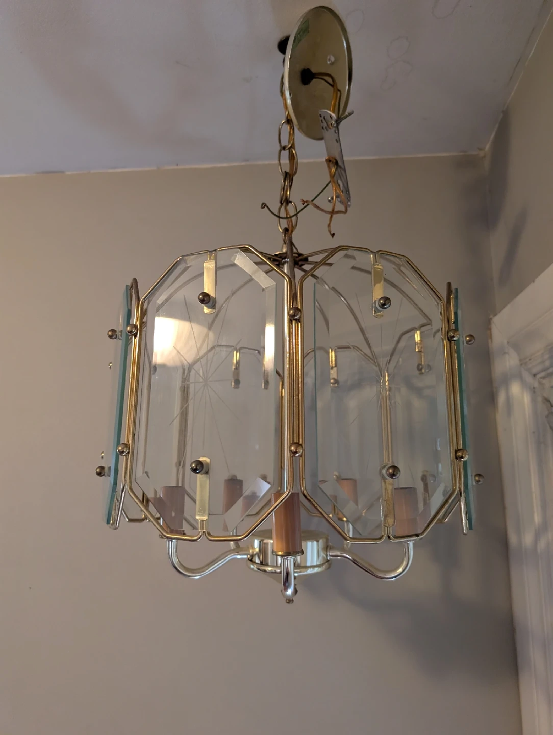 103 Chandeliers for sale. $21 each; all 3 for $50 #1: 5 candles enclosed in octogonal glass casing; hardwire to ceiling electrical fixture #2: 5 candles adorned with crystal-glass gems; hardwire to ceiling electrical fixture #3: 4 candles enclosed in cubic glass casing; long 14- foot chain/cord plugs into electrical outlet; includes ceiling hook 2 of 4 candles working, so $15 for this one.