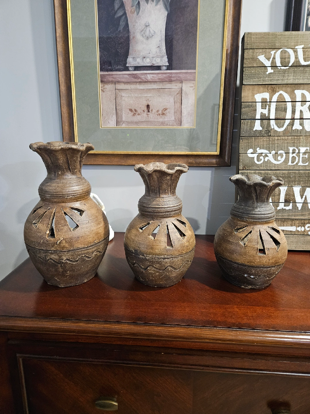 60Selling a set of three decorative brown ceramic vases. They have a unique design with cut-out patterns. They would look great as a centrepiece or on a shelf or you can put tea candles in them also.
