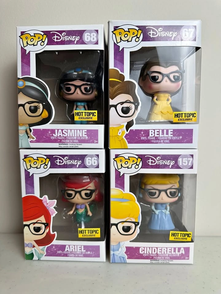This is a set of 3 Disney Princess Hipster Funko Pops. The Funko Pops Included are: 67 Belle - $15 68 Jasmine - $15 157 Cinderella - $15 If you take all of the Funko Pops above I can do $35 I have a lot more Funko Pops and I will be listing them on the marketplace, if you are interested look through my other listings, if you want multiple I'm sure we could make a deal!