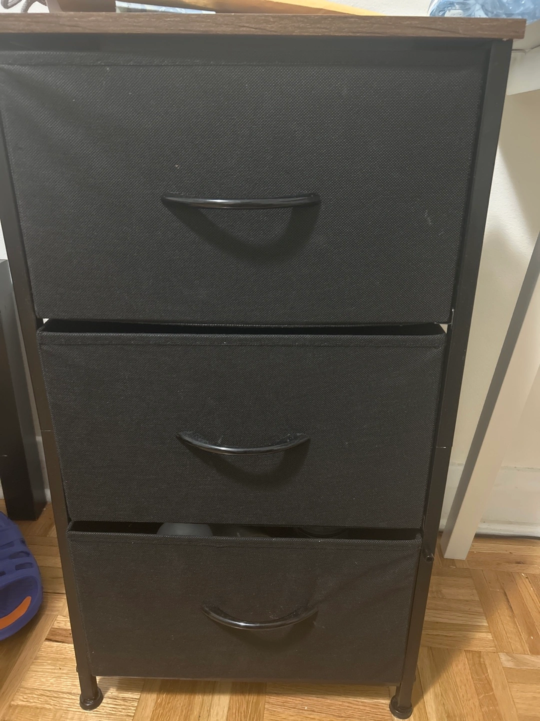 Selling a handy 3-drawer dresser! It's perfect for adding some extra storage to a bedroom, closet, or any small space. The drawers are made of a durable black fabric, and the frame is sturdy. Great for keeping things organized!