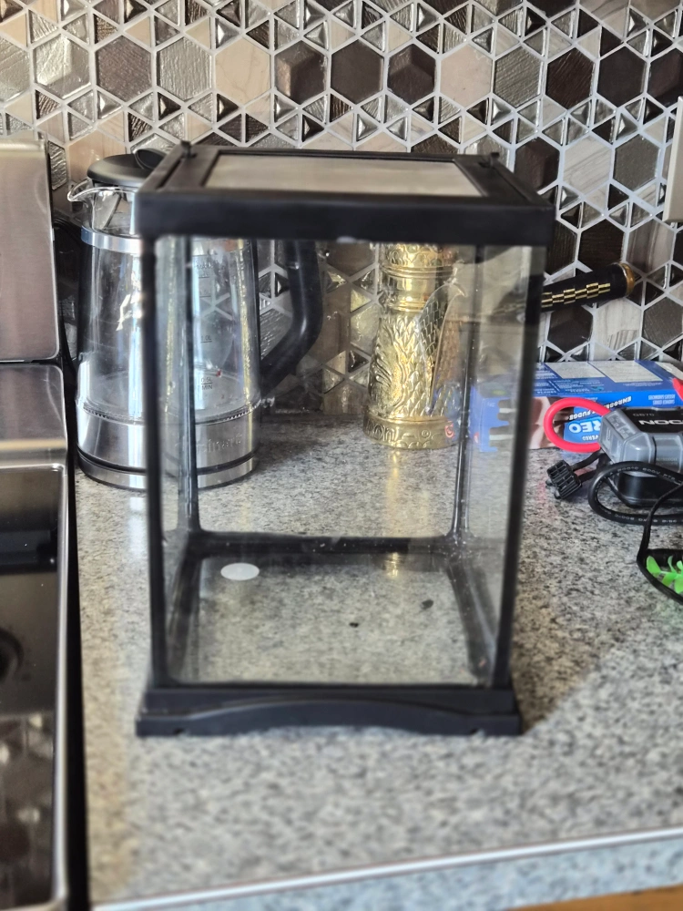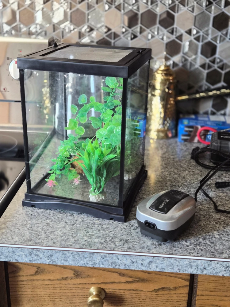 3-Gallon Fish Tank – Great for Shrimp or Betta Fish! This 3-gallon aquarium is in great condition and holds water perfectly. It comes with an air pump, colorful fake plants, and a mesh lid to keep everything secure while allowing airflow. Perfect size for shrimp, a single betta fish, or a small aquascape setup. Ready to use — just add water and your fish!