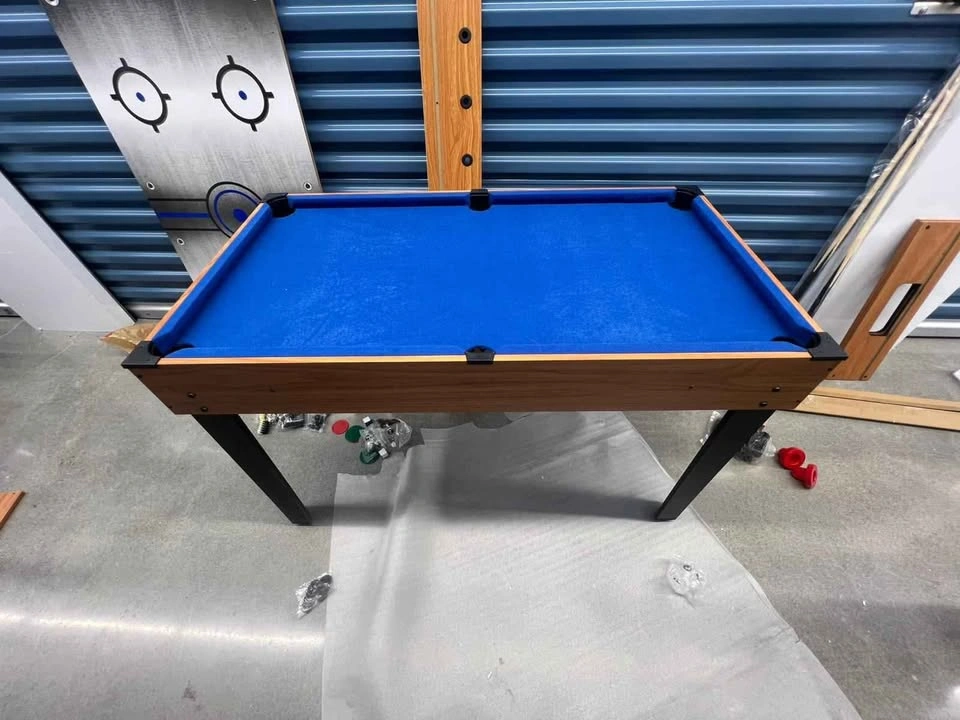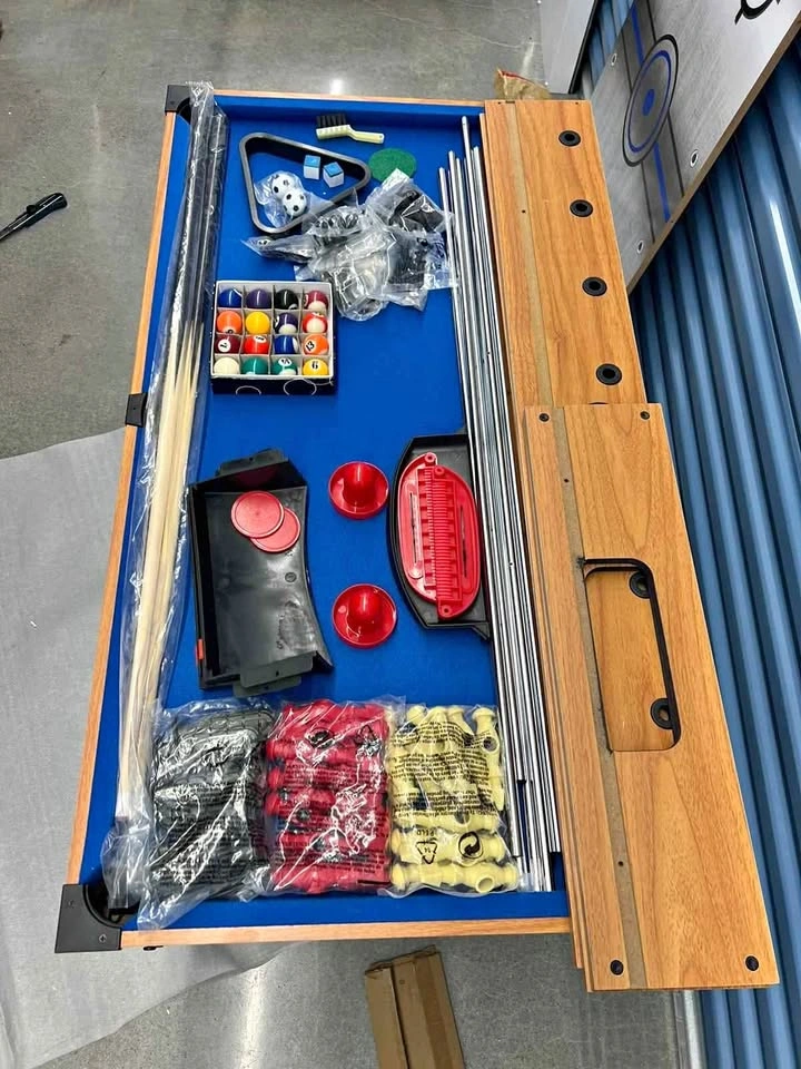 Multi-Game Fun in One Table! Enjoy 3 classic games in one — Foosball, Billiards, and Air Hockey. Quick-swap tabletop design makes switching between games fast and easy. Size: 48"L × 23"W × 32.5"H Sturdy frame with solid legs for stability Includes all accessories — cues, pucks, paddles, foosballs, and billiard set Perfect for family rooms, basements, offices, or game nights Brand new, pulled from a liquidation pallet All parts and instructions included