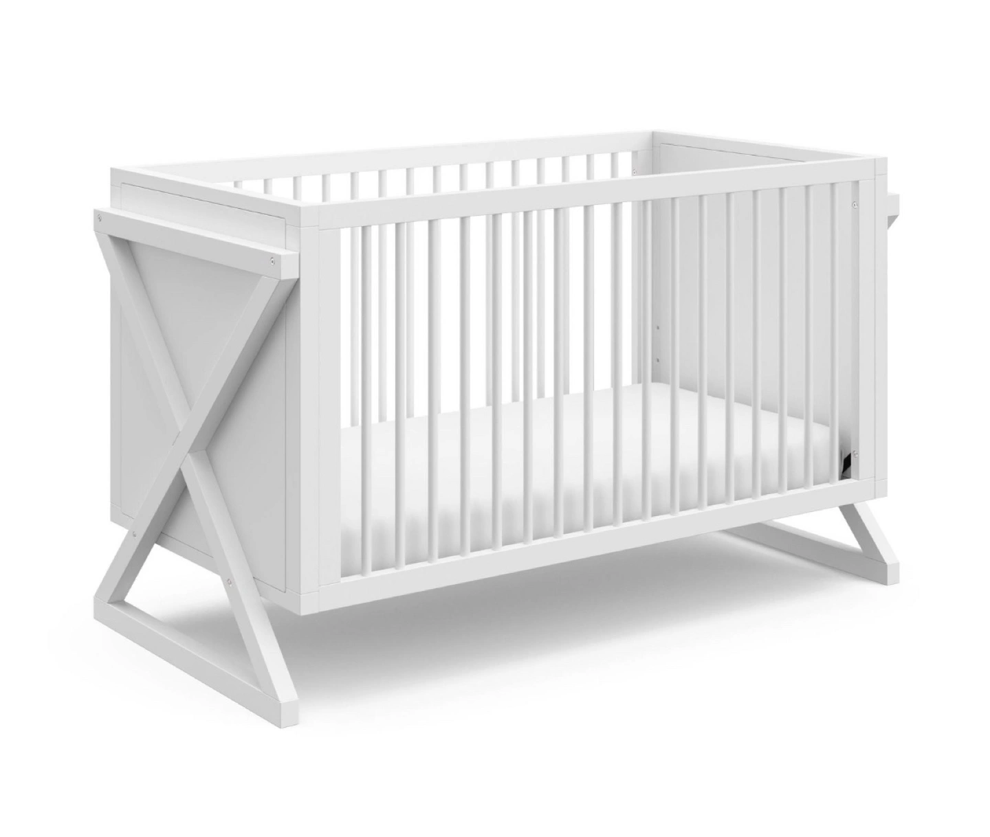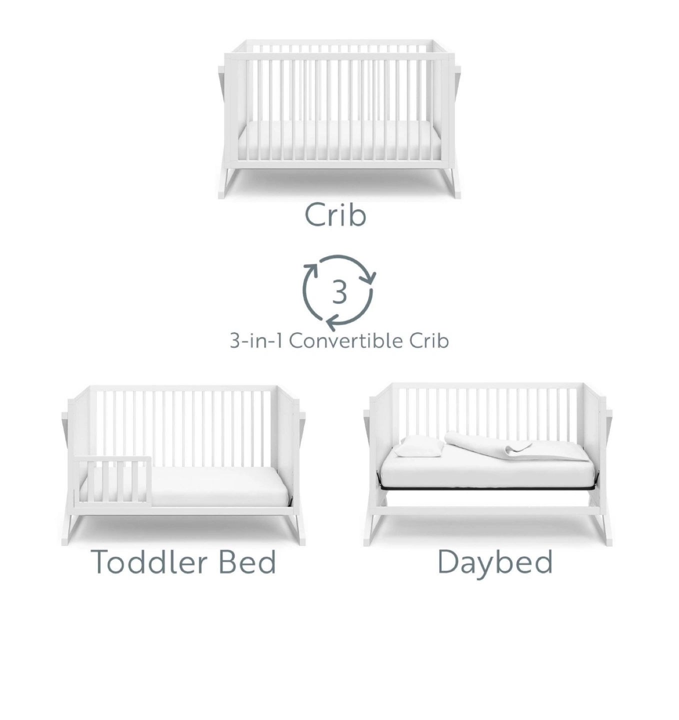 Brand new in Box White crib that converts to a toddler bed and daybed. Features a sleek modern design.